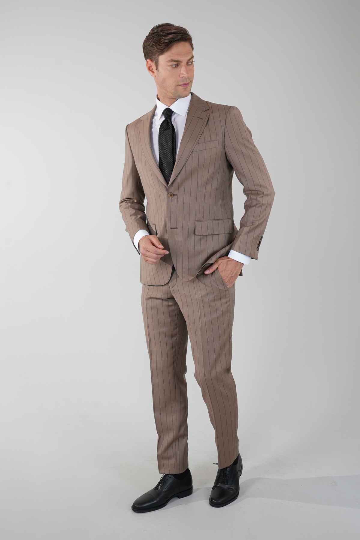 Açık Kahve Comfort Fit Mono Yaka Çift Yırtmaçlı Sedef Düğmeli 6 Drop Yün Takım Elbise