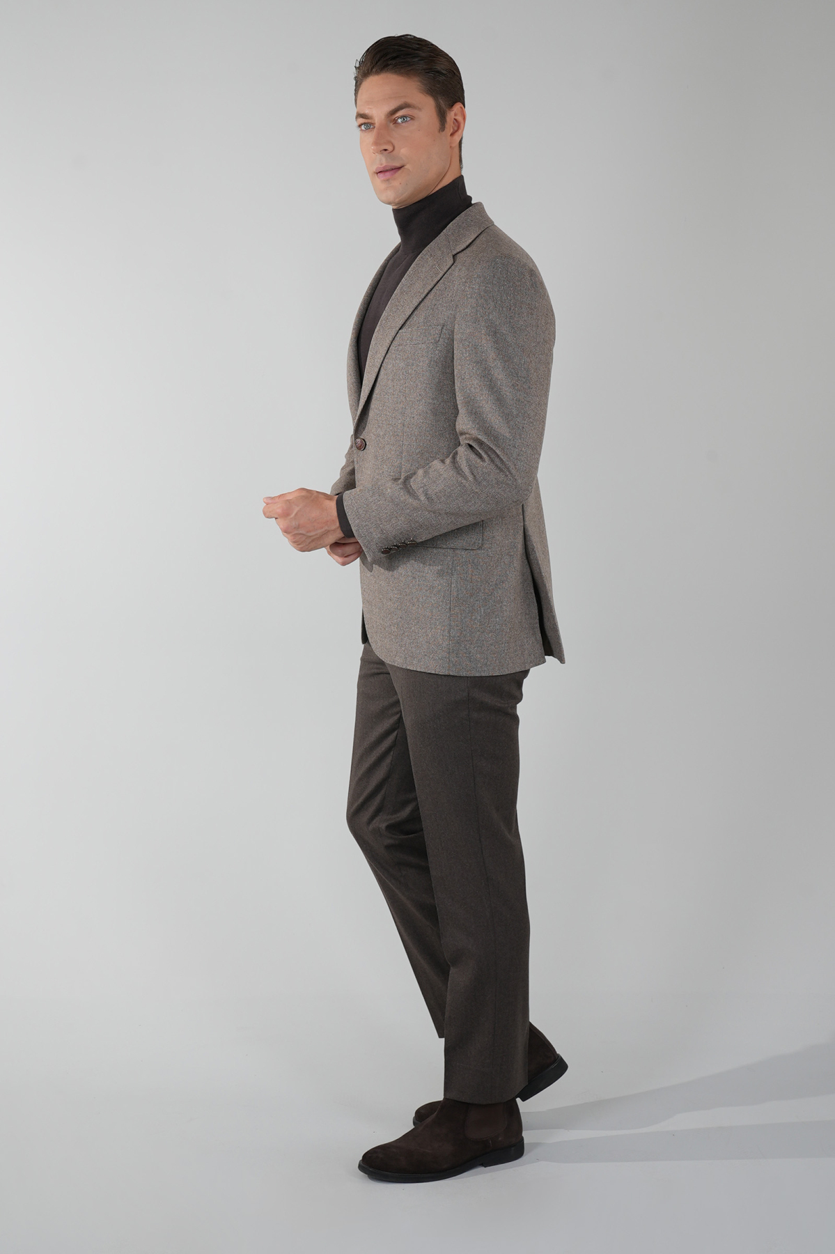 Comfort Fit Bej Mono Yaka Çift Yırtmaçlı 6 Drop Yün Erkek Ceket