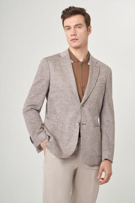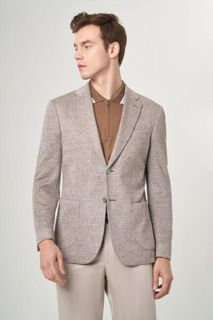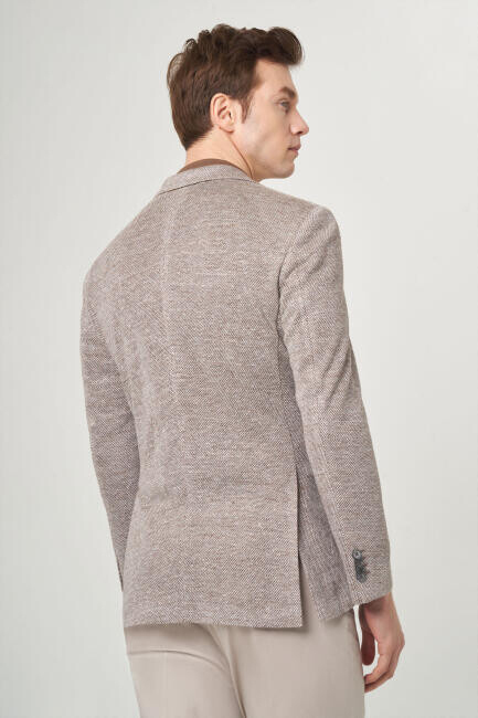 Erkek Bej 2 Düğmeli Çift Yırtmaçlı Mono Yaka Ceket