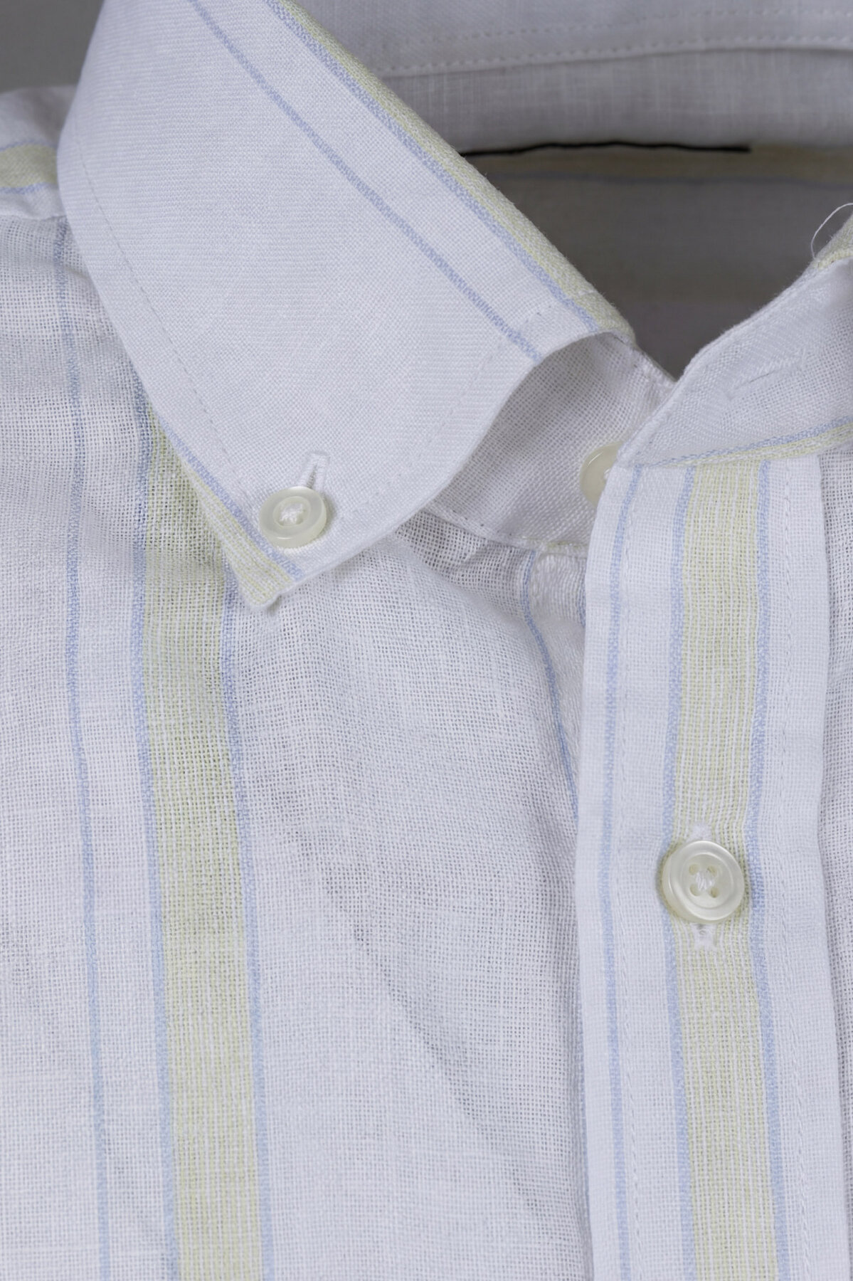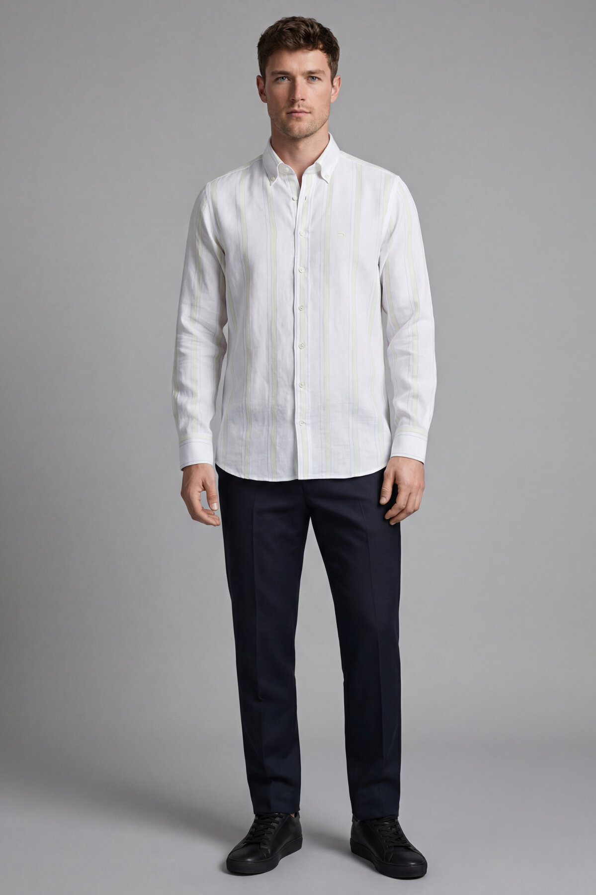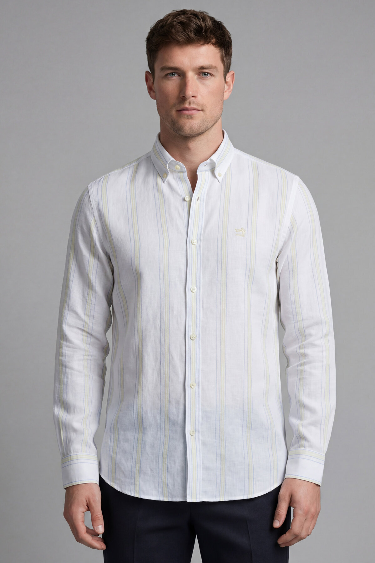 Erkek Regular Fit Uzun Kol Keten Paşa Yaka Sarı Gömlek