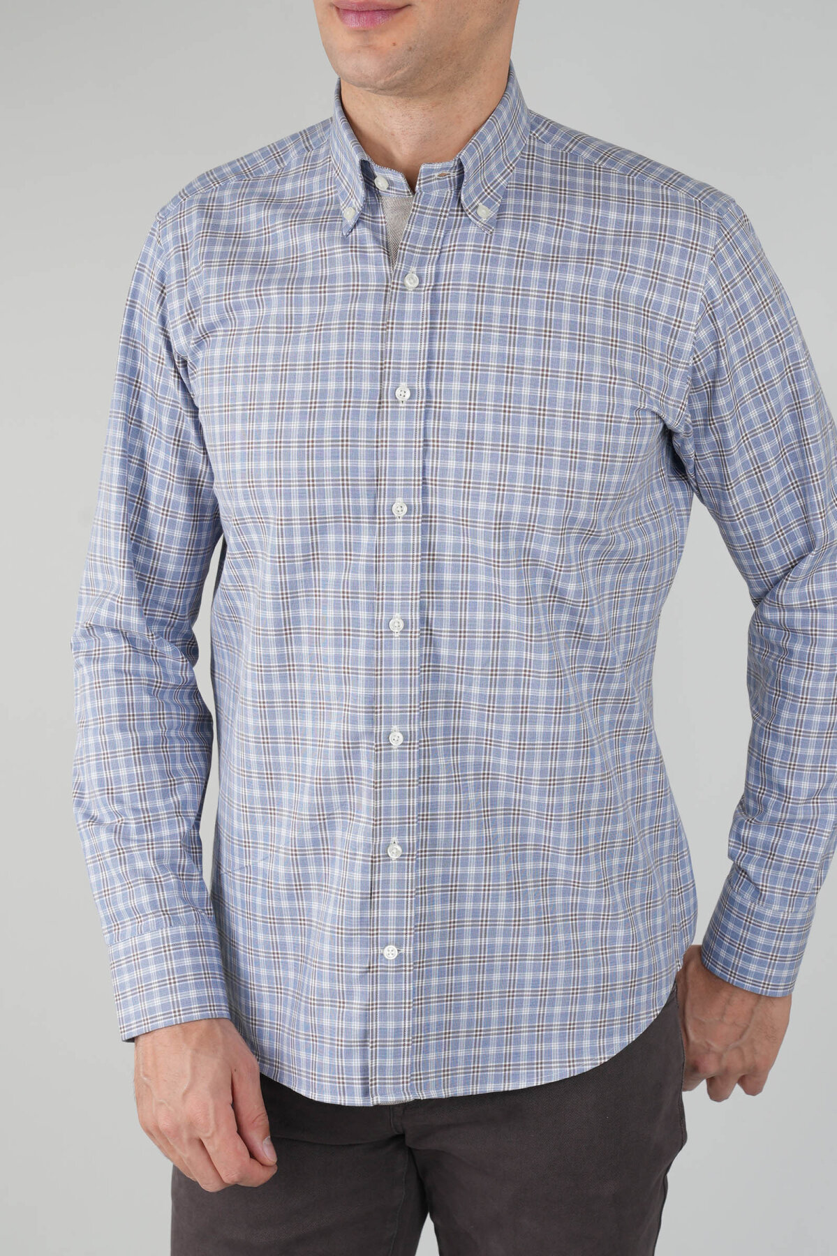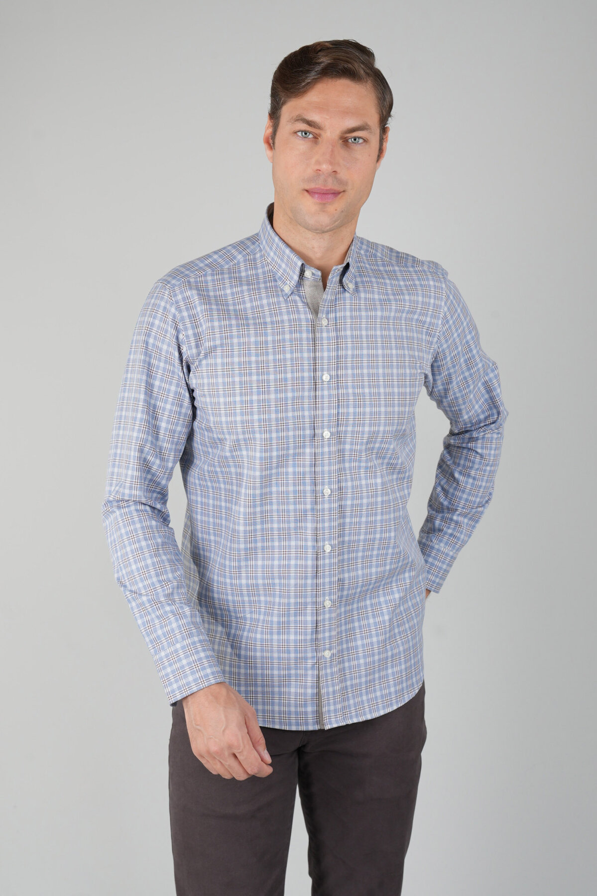 Erkek Uzun Kollu Regular Fit Pamuk Gömlek Mavi-Bej Bej