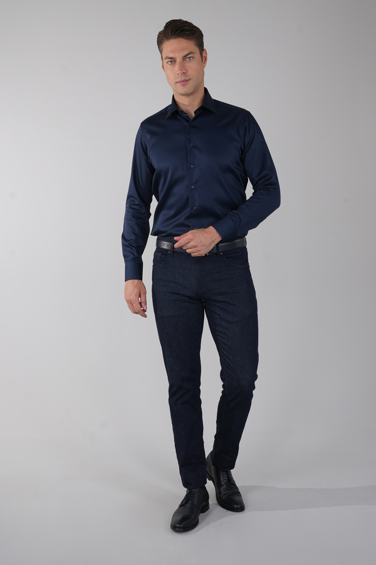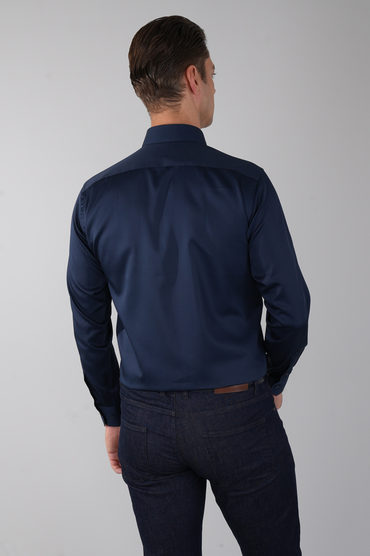 Lacivert Uzun Kol Klasik Yaka Cepsiz Saten Erkek Gömlek