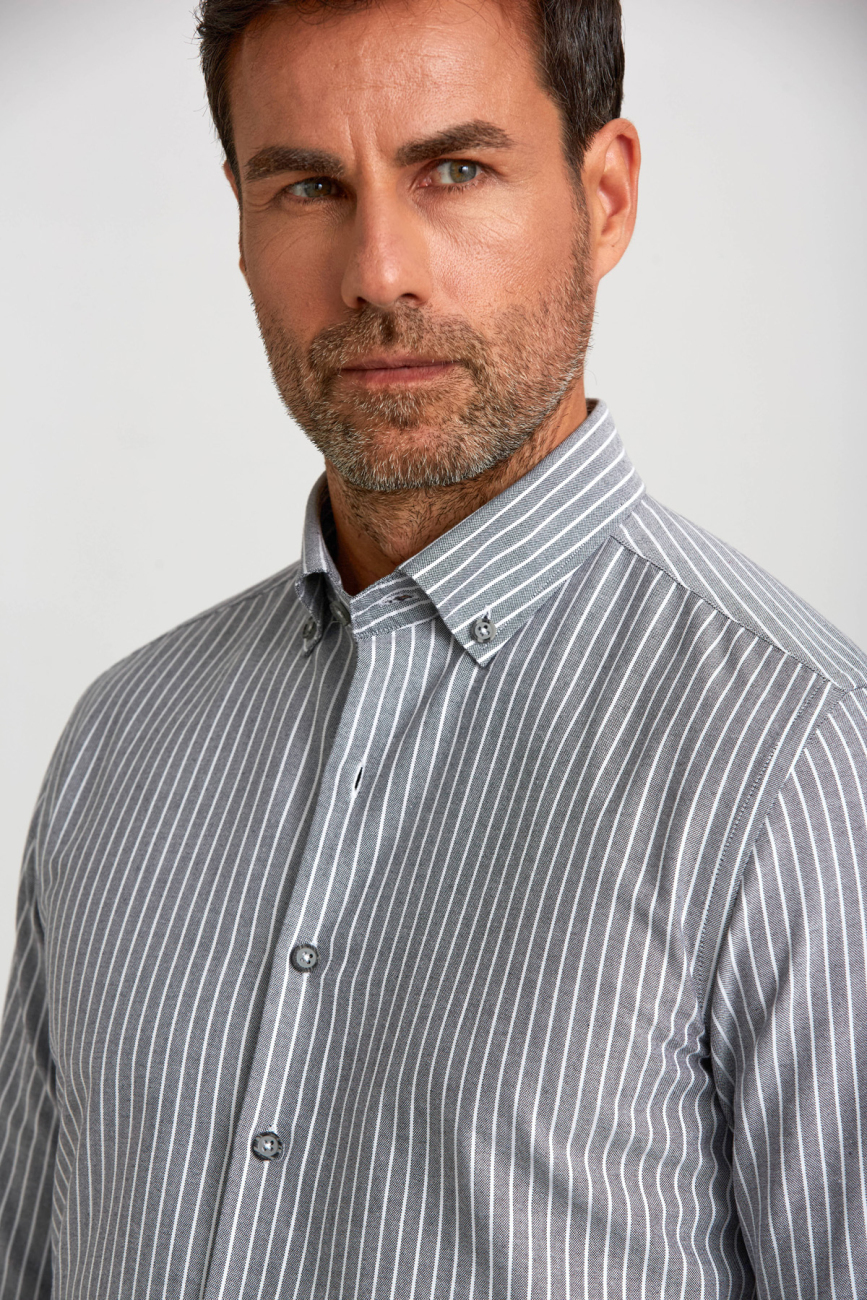 Modern Fit Düğmeli Yaka Çizgili Siyah Spor Erkek Gömlek