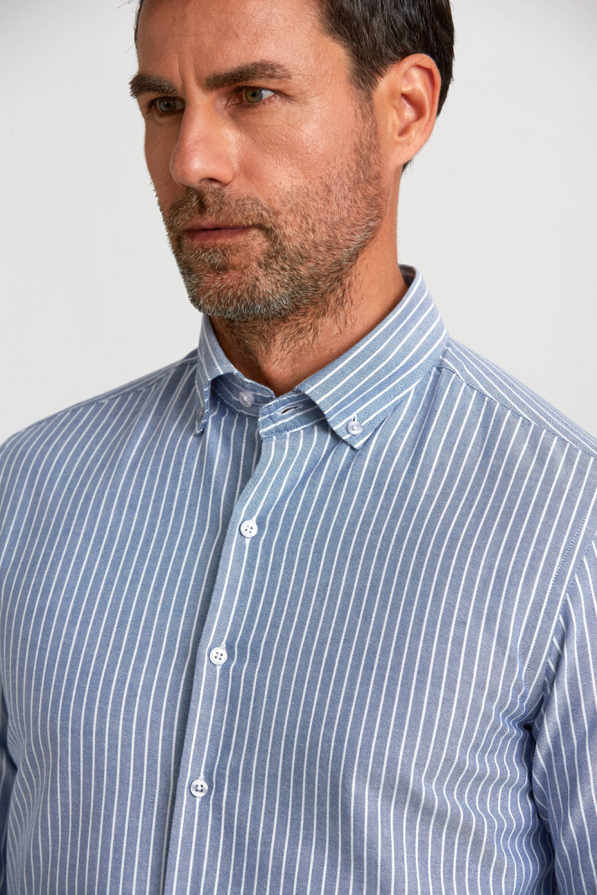 Modern Fit Paşa Yaka Çizgili Lacivert Spor Erkek Gömlek