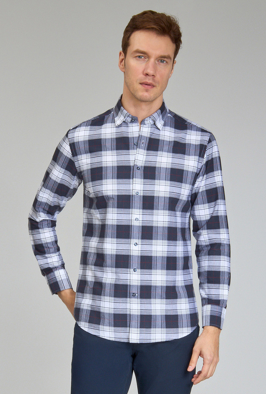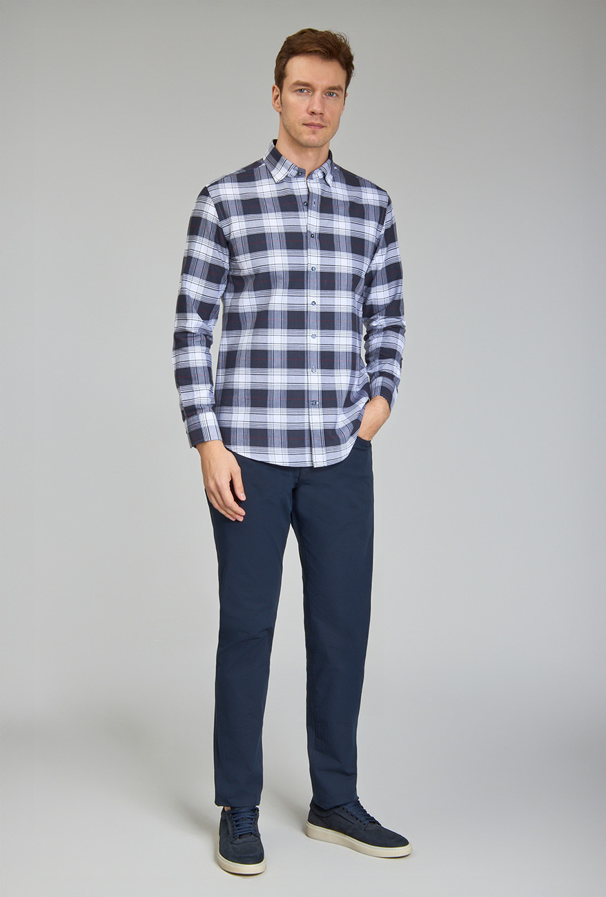 Modern Fit Paşa Yaka Ekose Lacivert Spor Erkek Gömlek