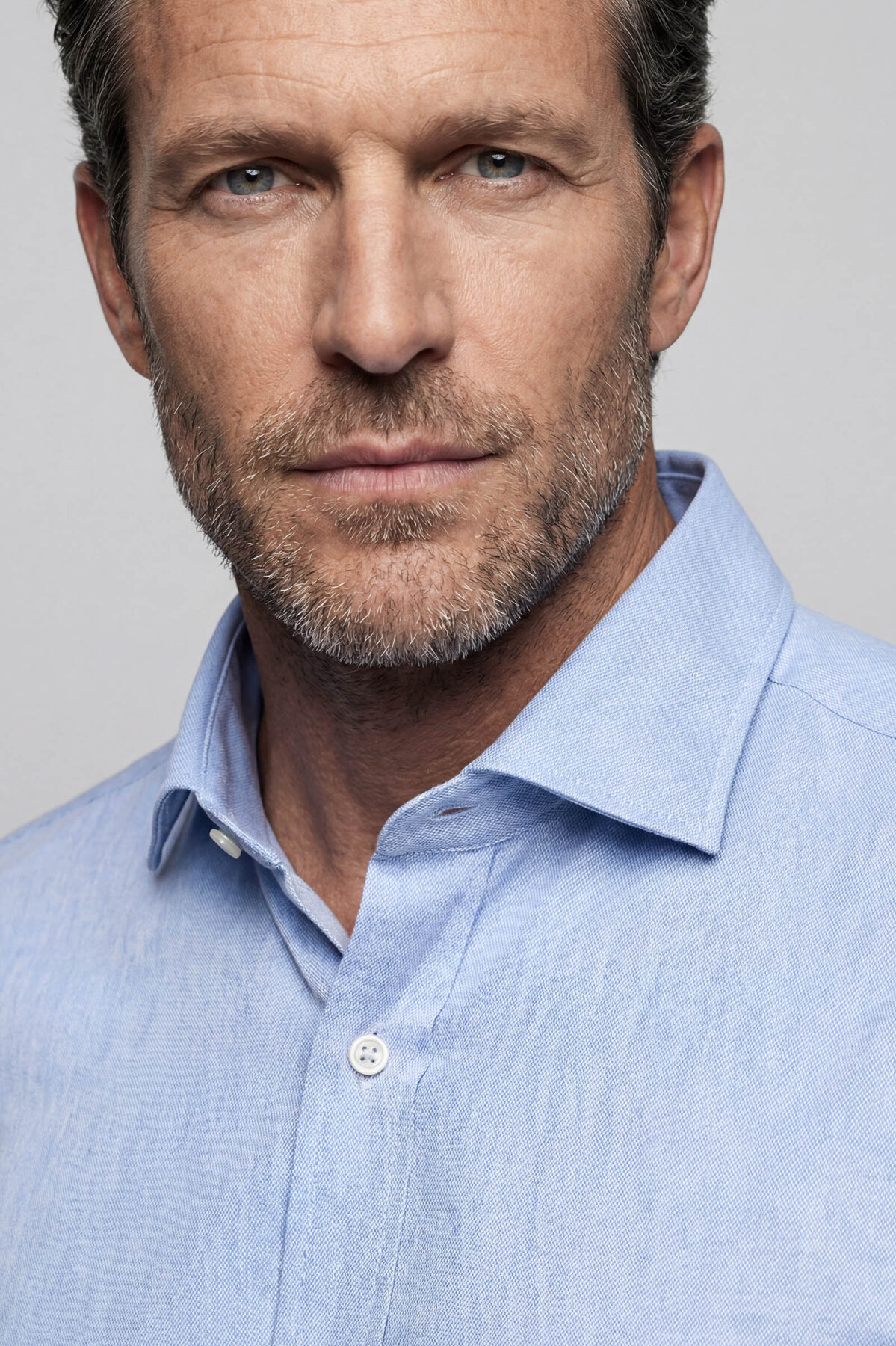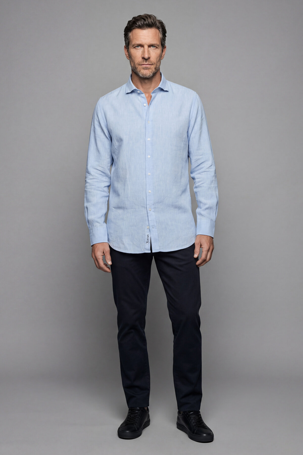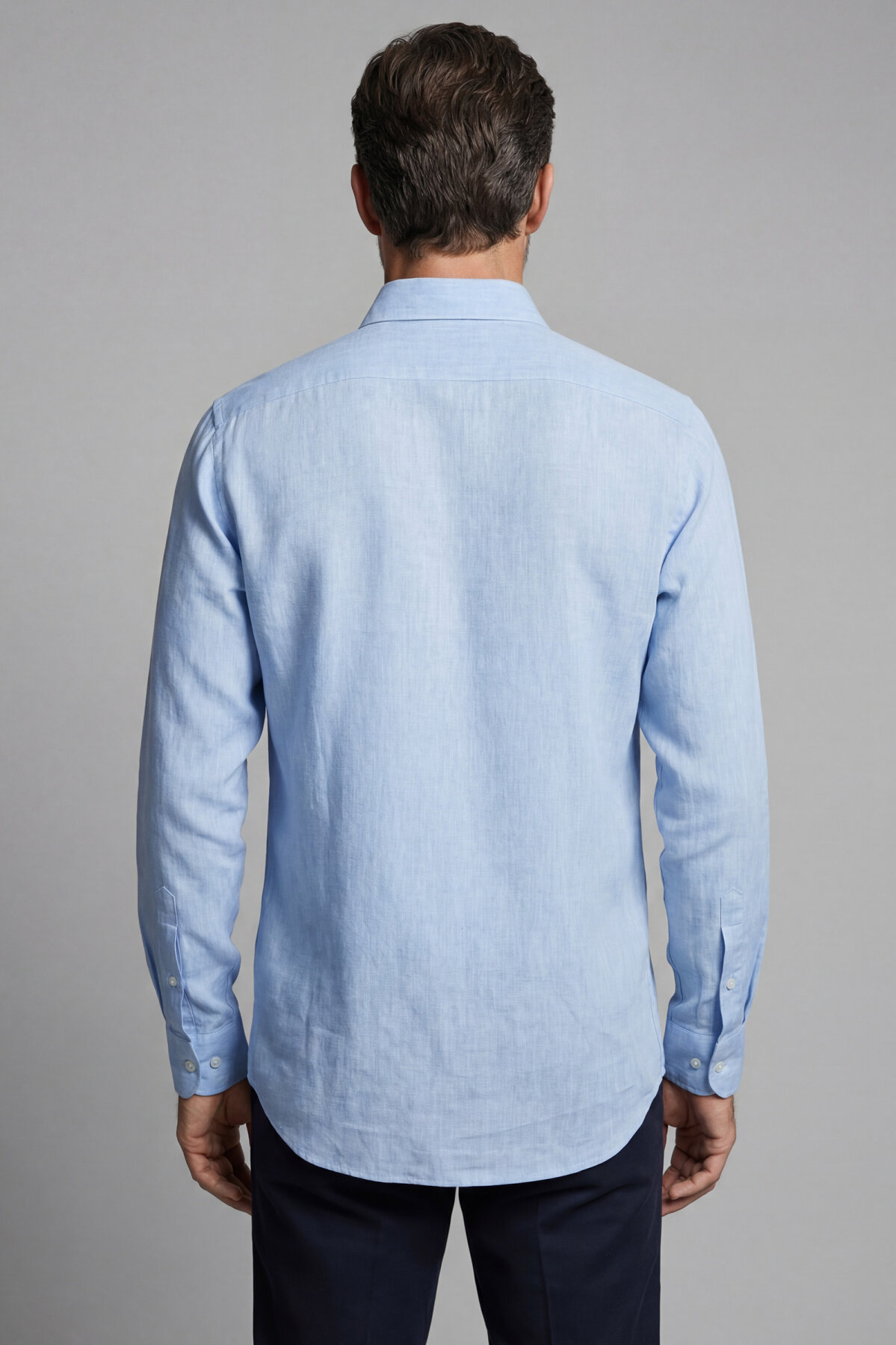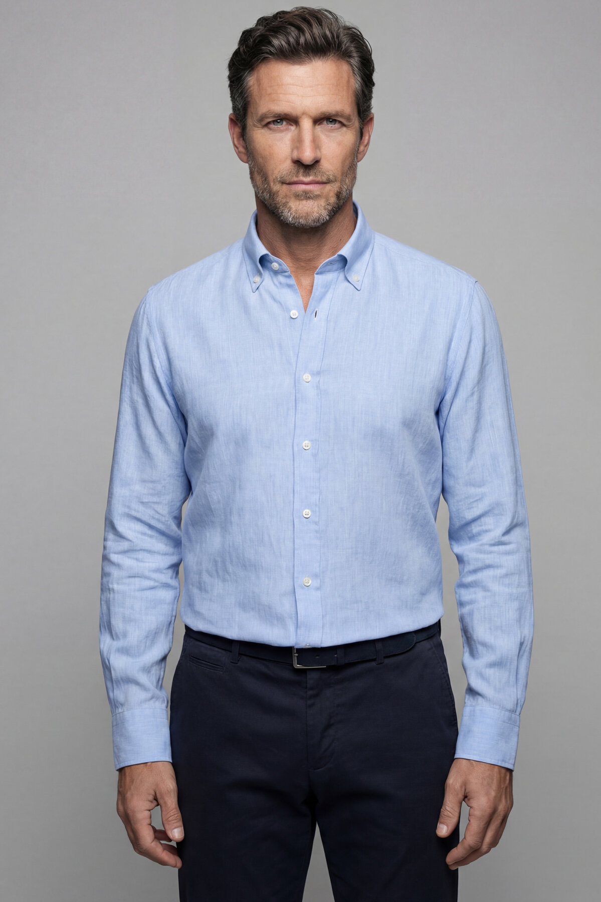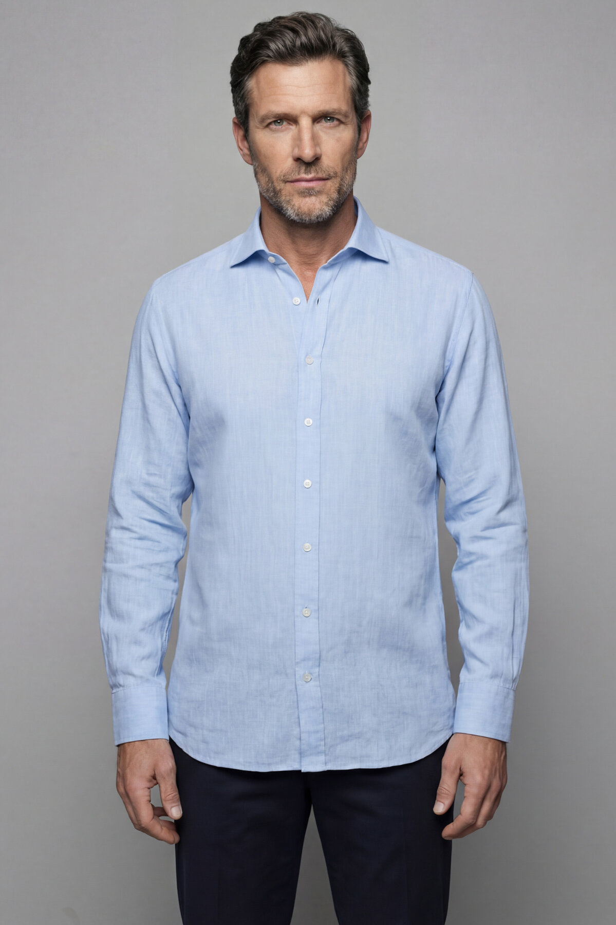 Regular Fit Alt Birit Yaka Pamuk Keten Mavi Erkek Gömlek