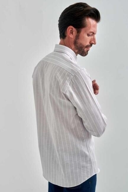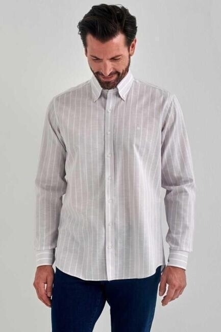 Regular Fit Gri Çizgili Düğmeli Yaka Spor Erkek Gömlek Gri