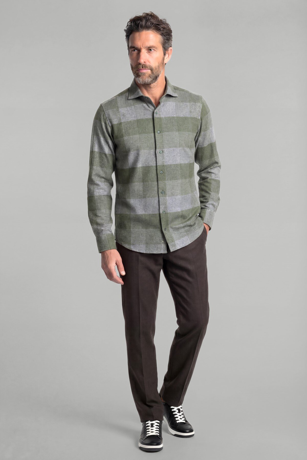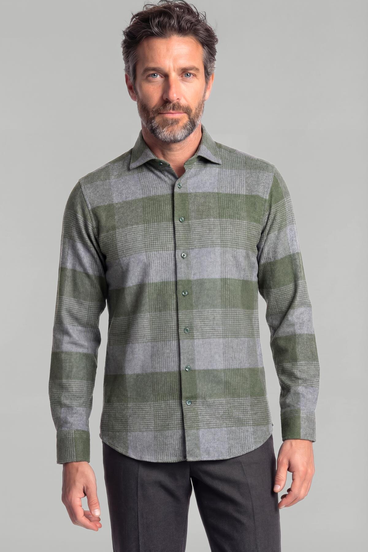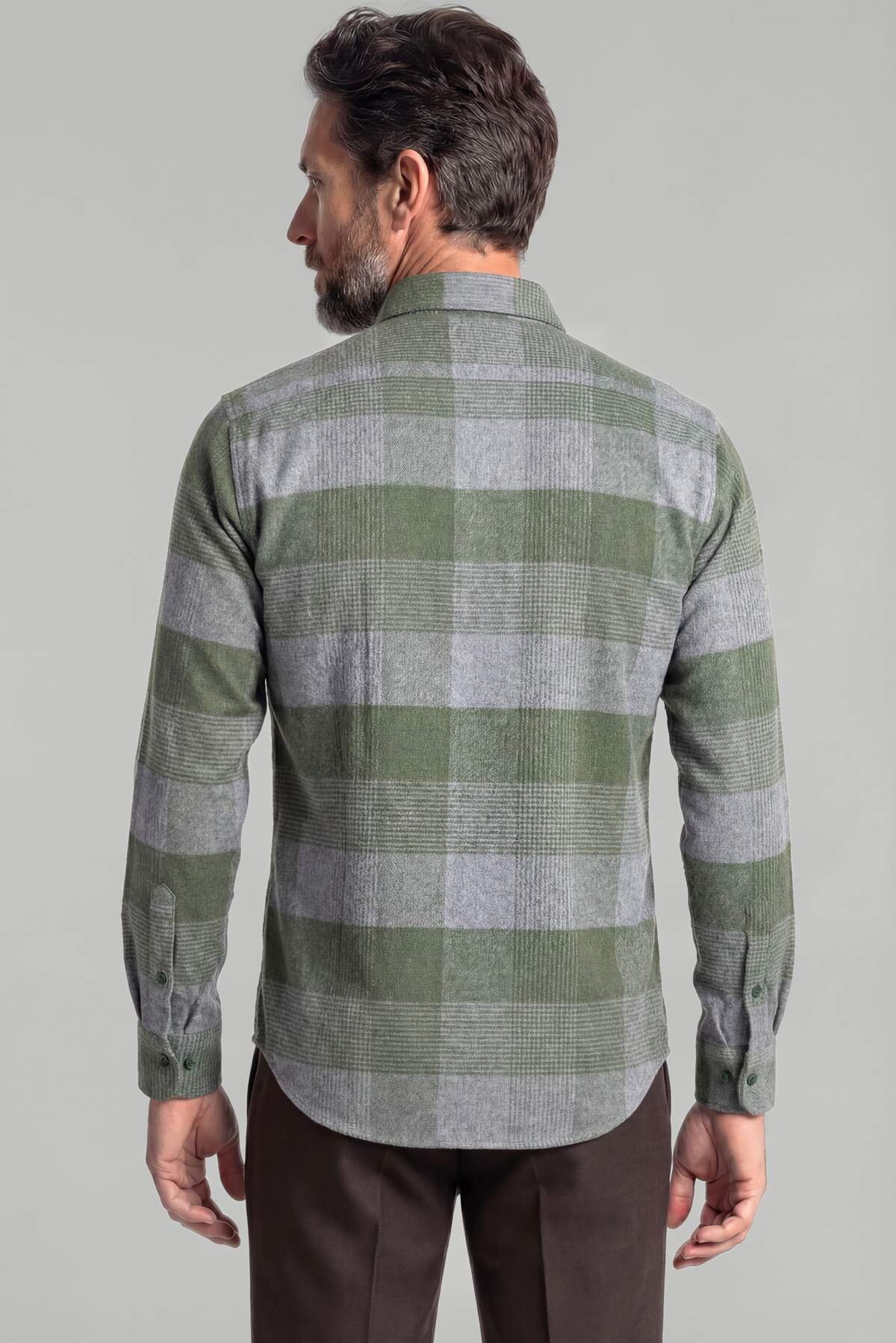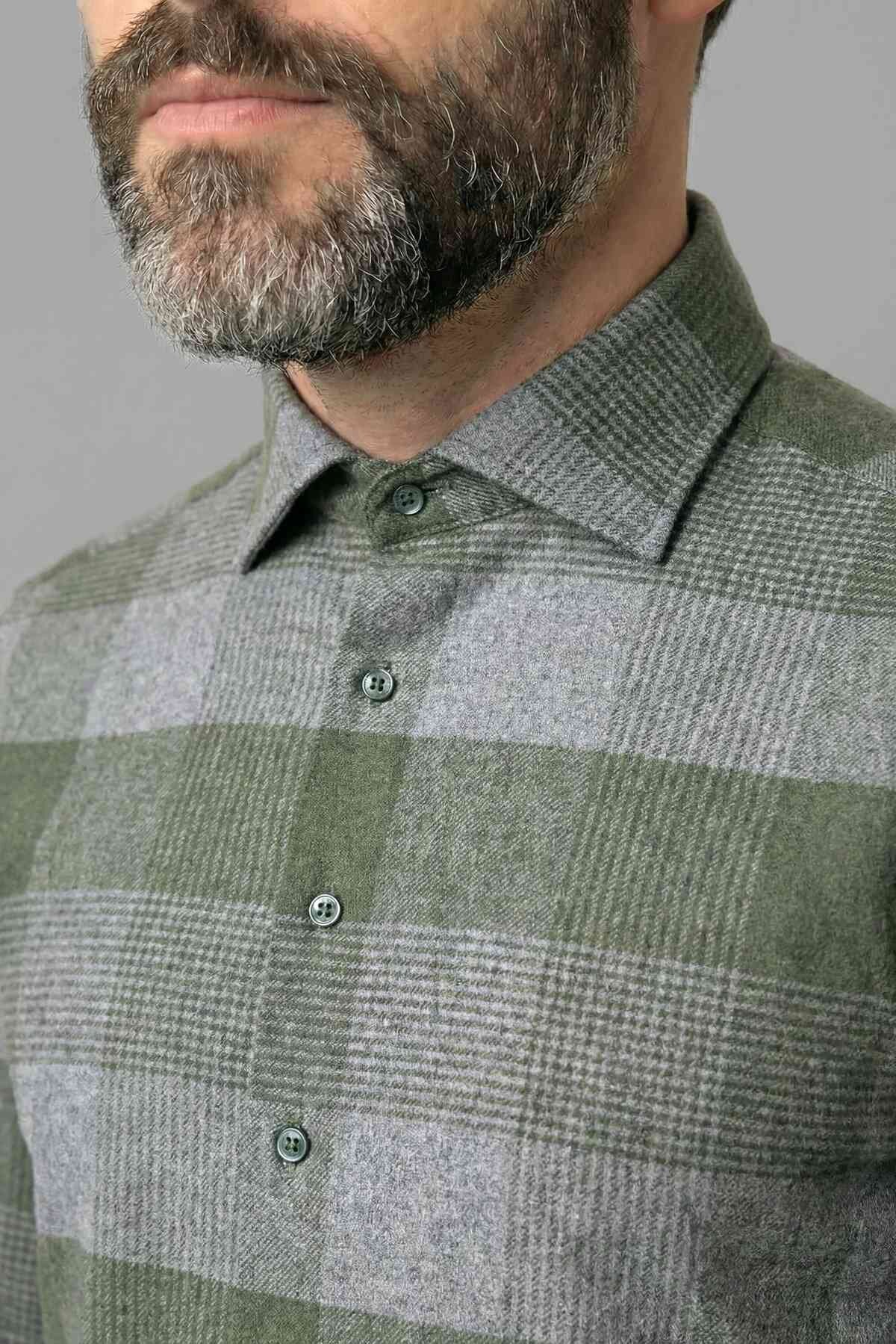 Regular Fit İtalyan Yaka Flanel Ekoseli Pamuk Yeşil Erkek Gömlek