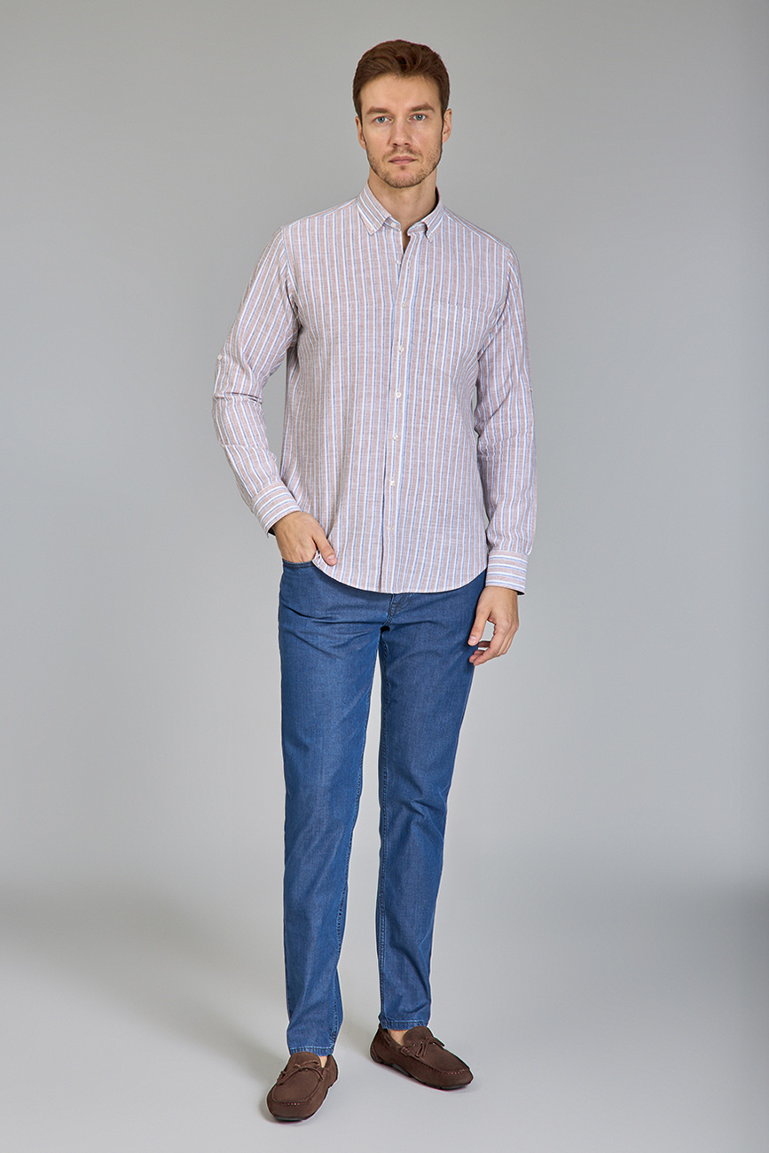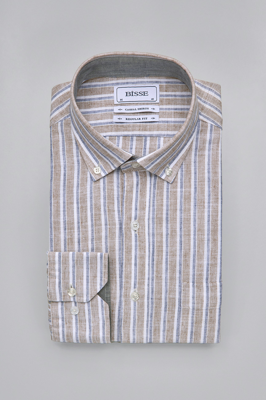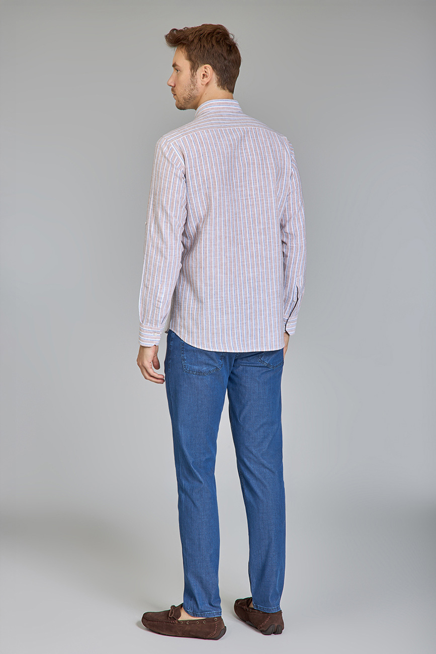 Regular Fit Paşa Yaka Çizgili Kahve Pamuk Keten Erkek Gömlek