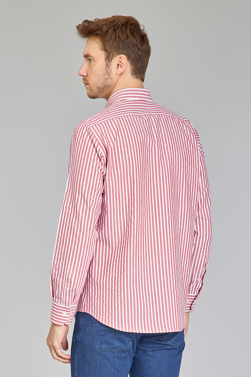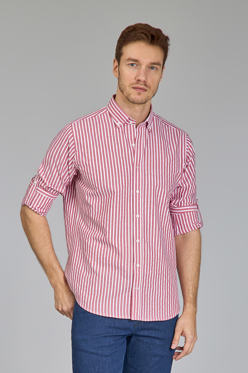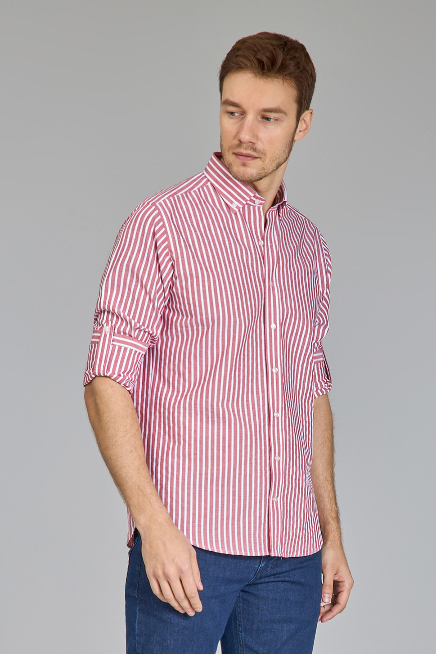 Regular Fit Paşa Yaka Çizgili Kırmızı Pamuk Erkek Gömlek