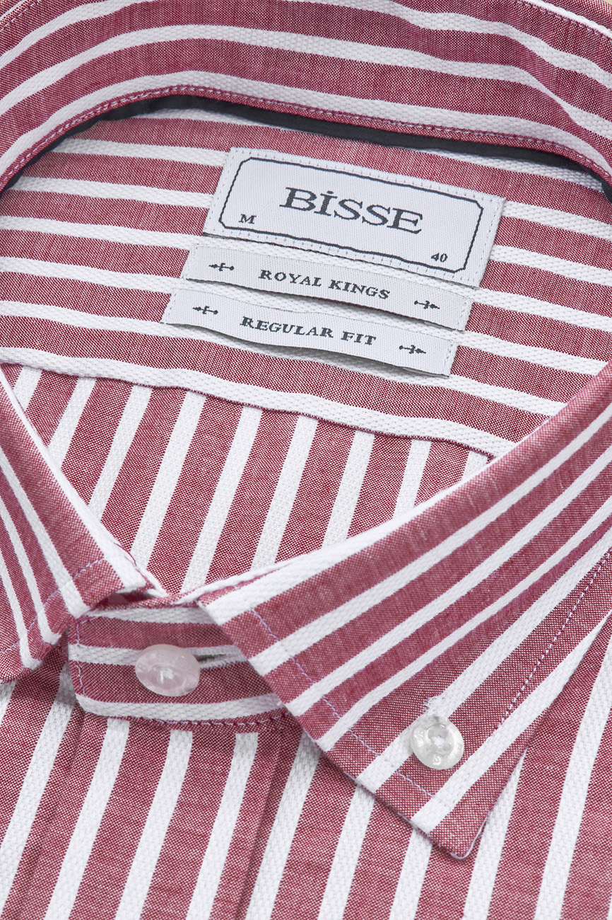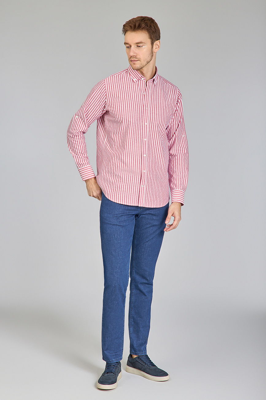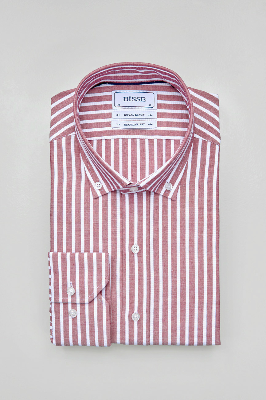 Regular Fit Paşa Yaka Çizgili Kırmızı Pamuk Erkek Gömlek