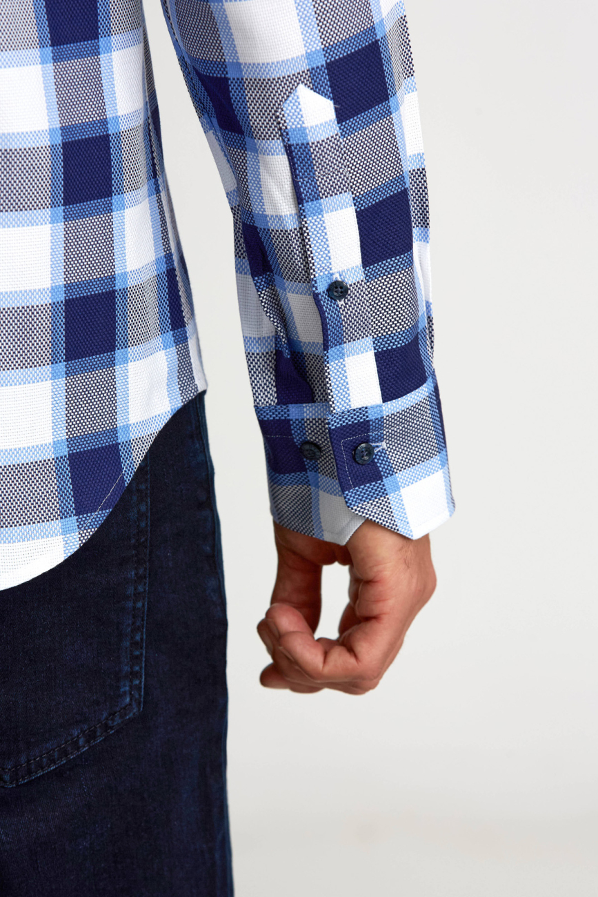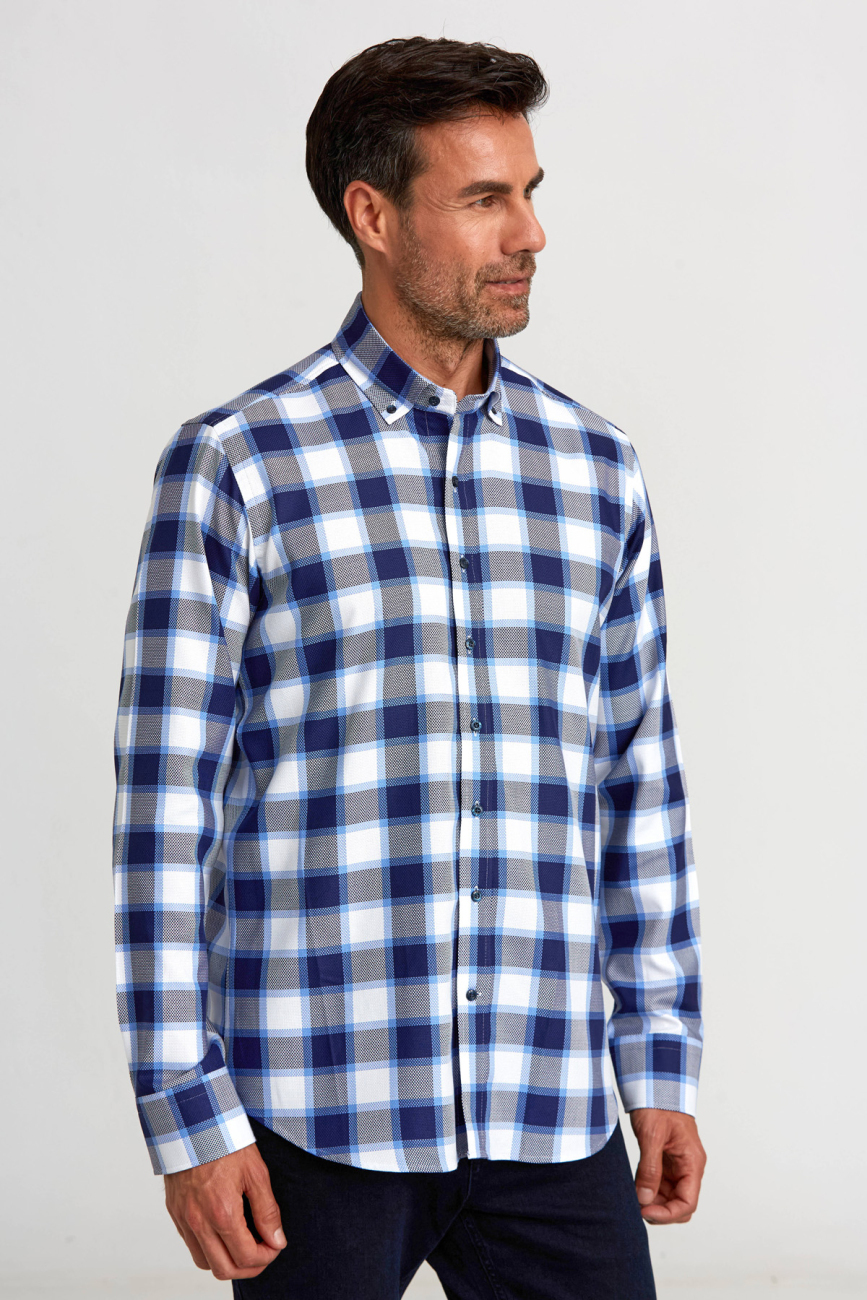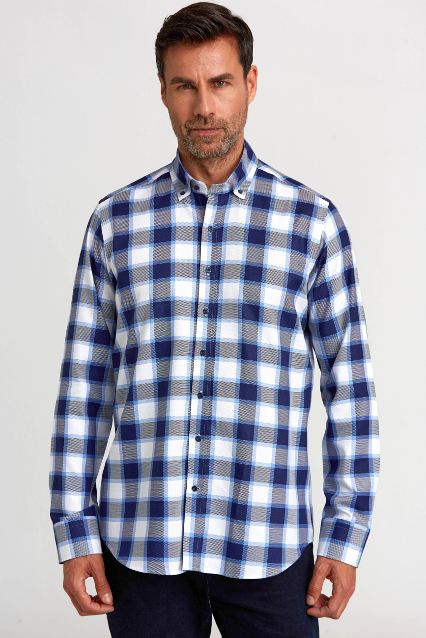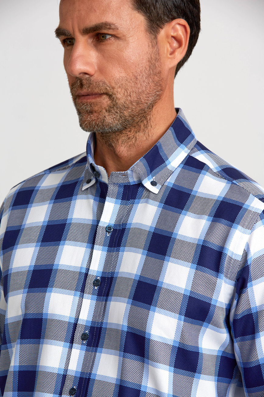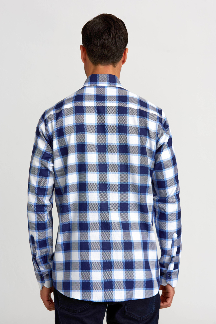 Regular Fit Paşa Yaka Düğmeli Mavi Ekoseli Pamuk Spor Erkek Gömlek