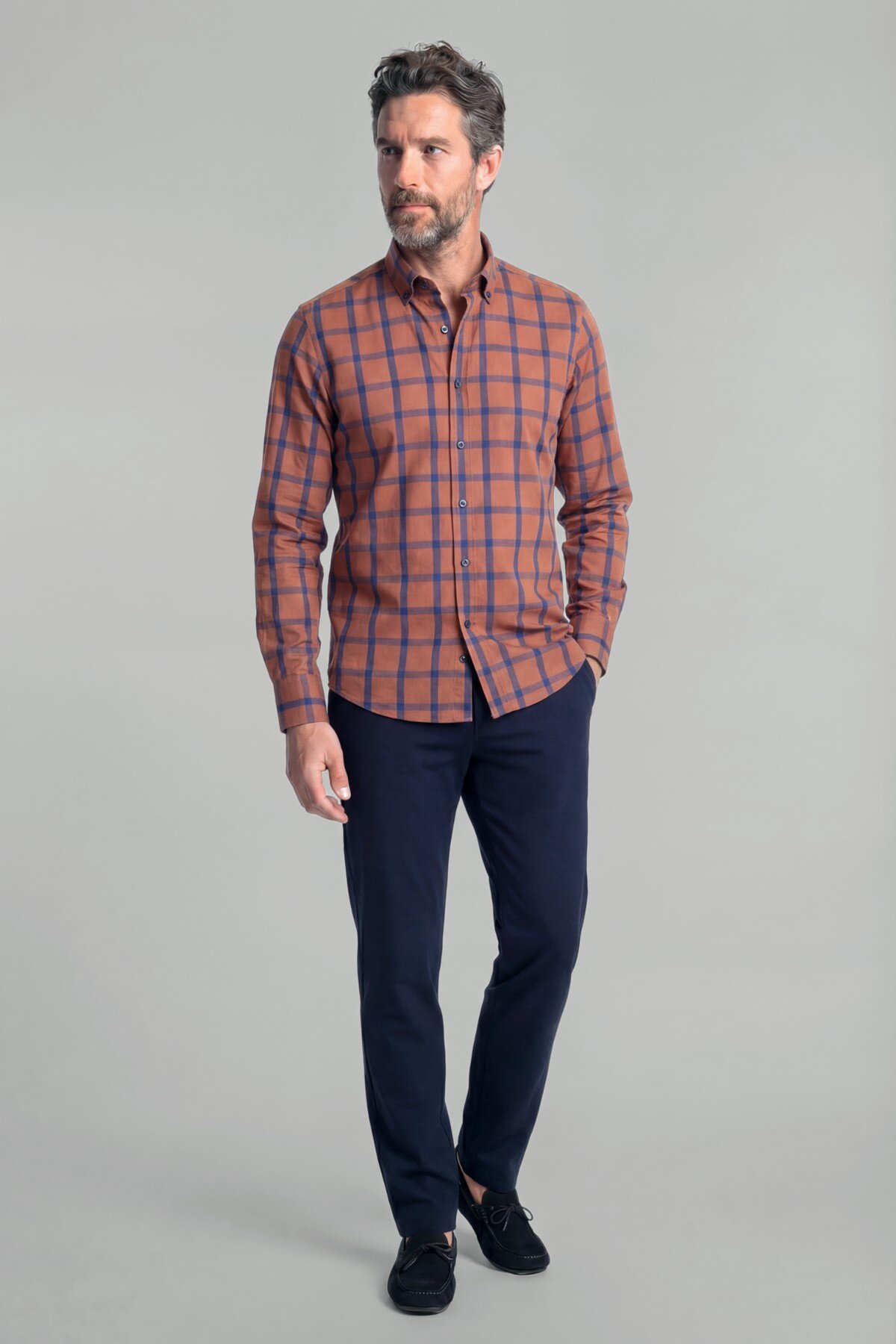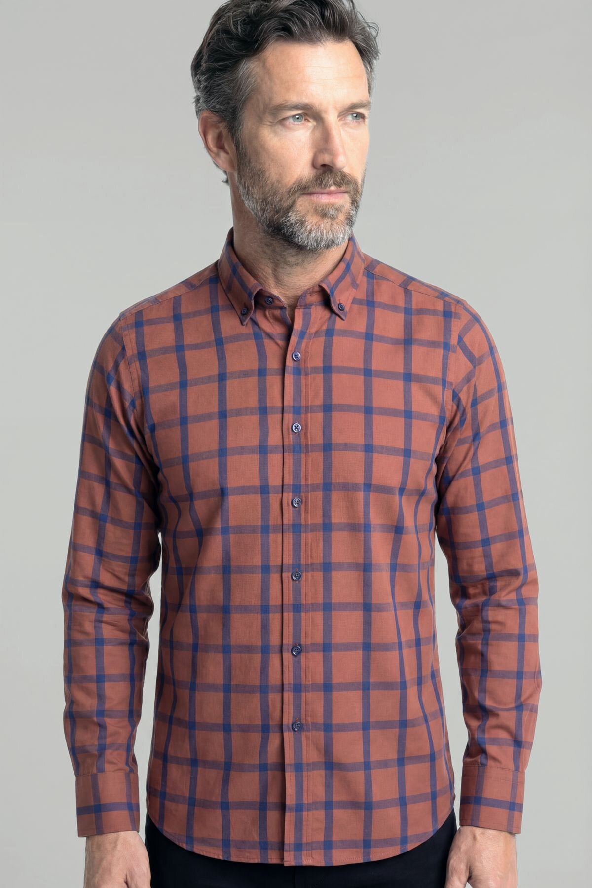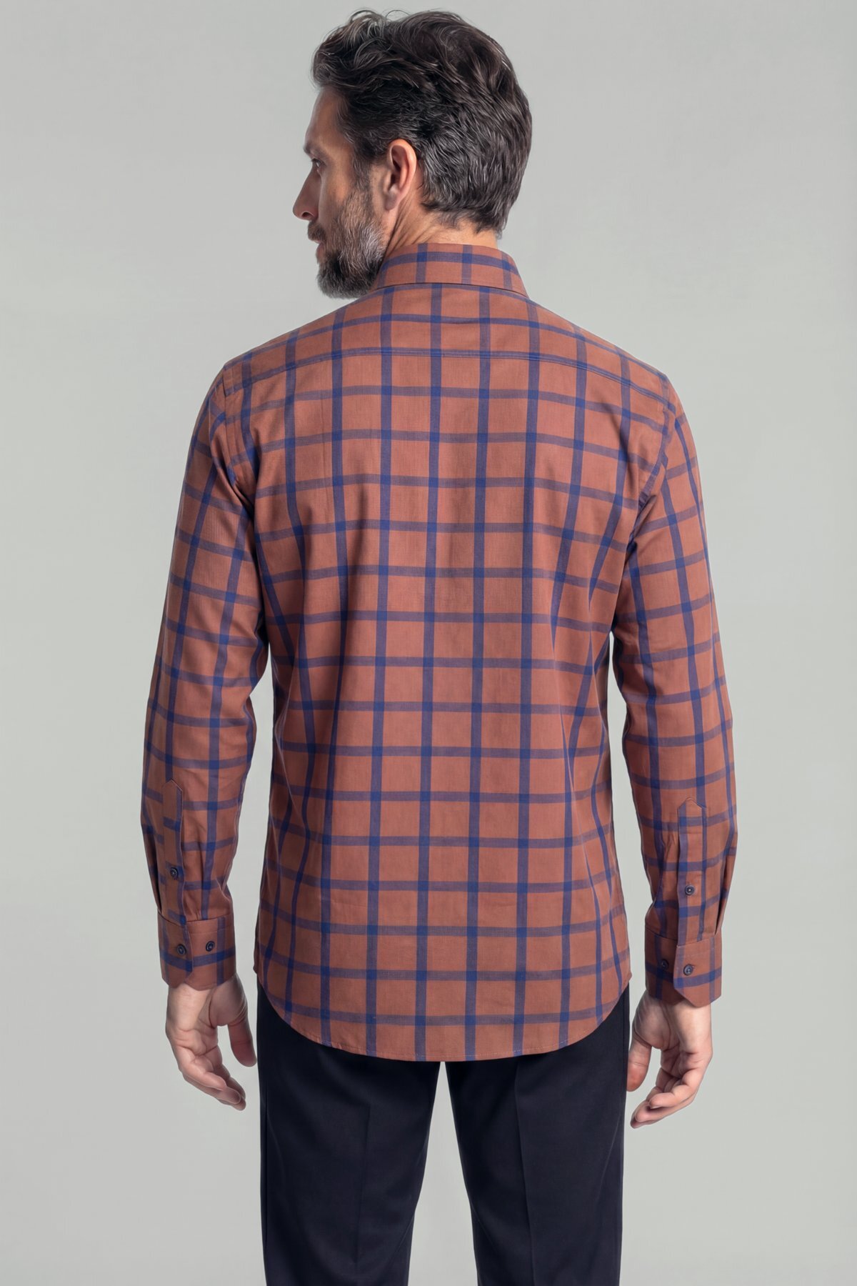 Regular Fit Paşa Yaka Ekose Pamuk Kiremit Erkek Gömlek