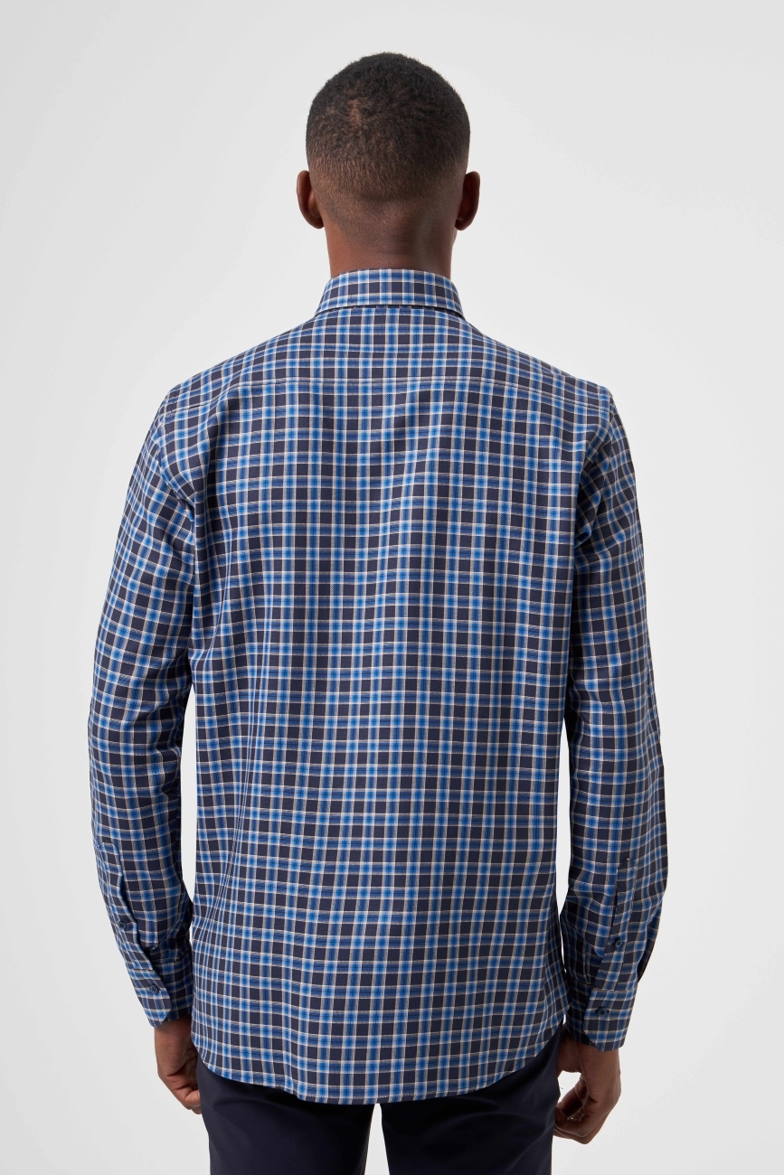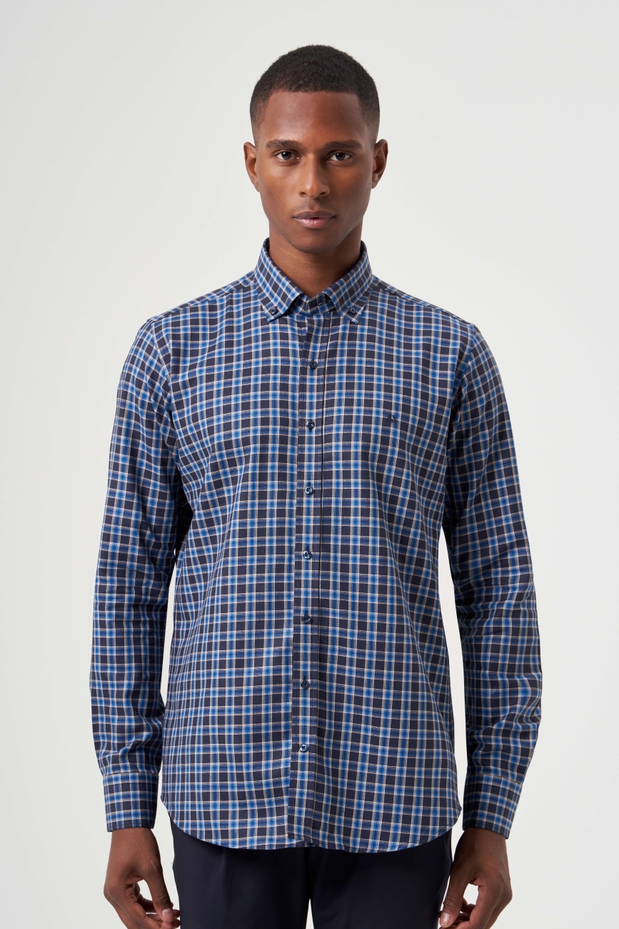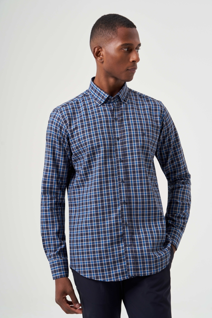 Regular Fit Paşa Yaka Ekoseli Lacivert Spor Erkek Gömlek