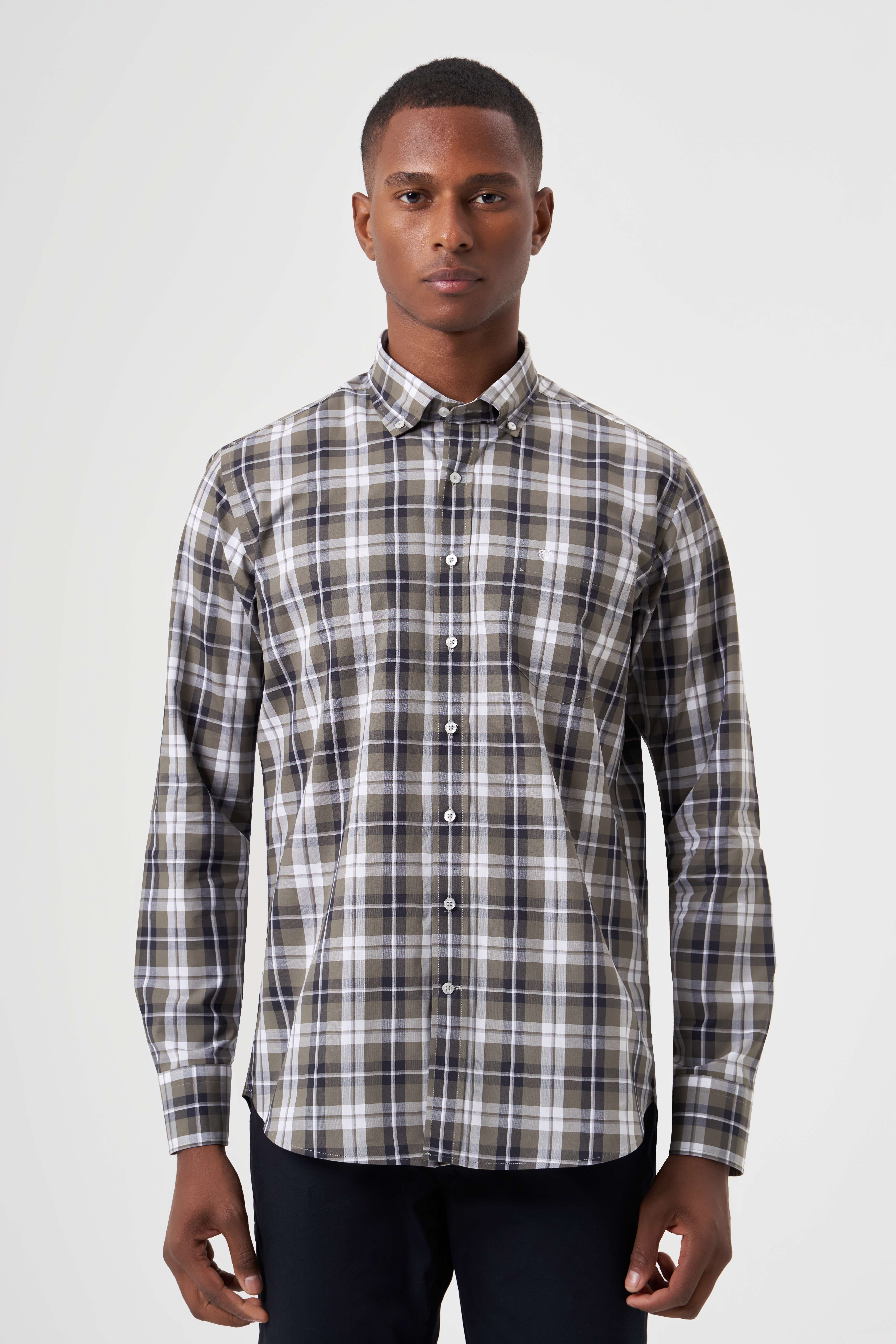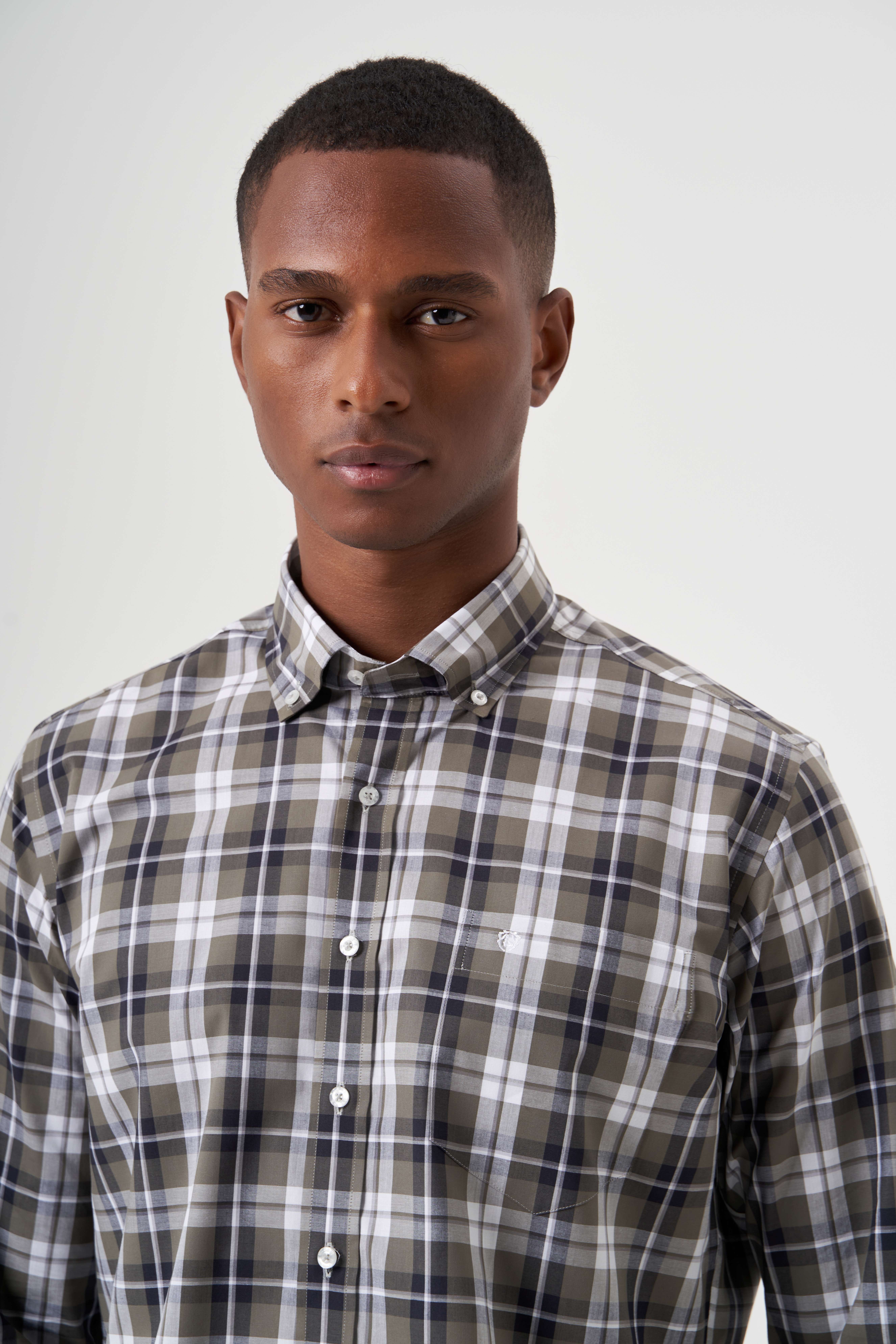 Regular Fit Paşa Yaka Haki Ekoseli Erkek Gömlek