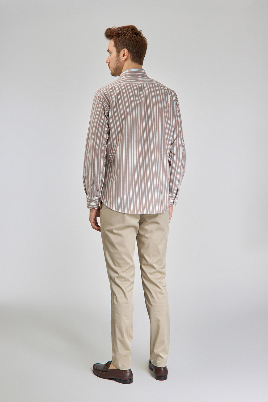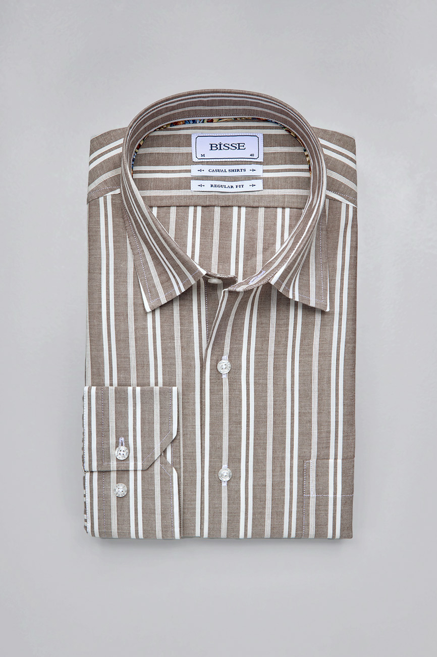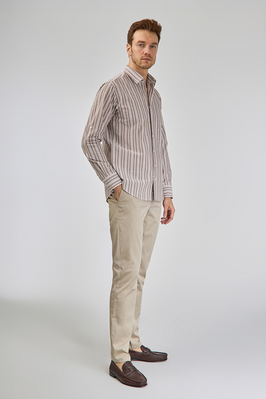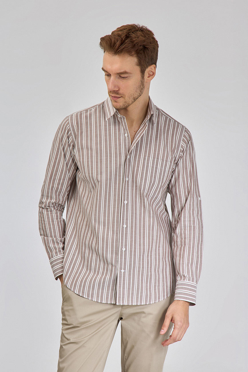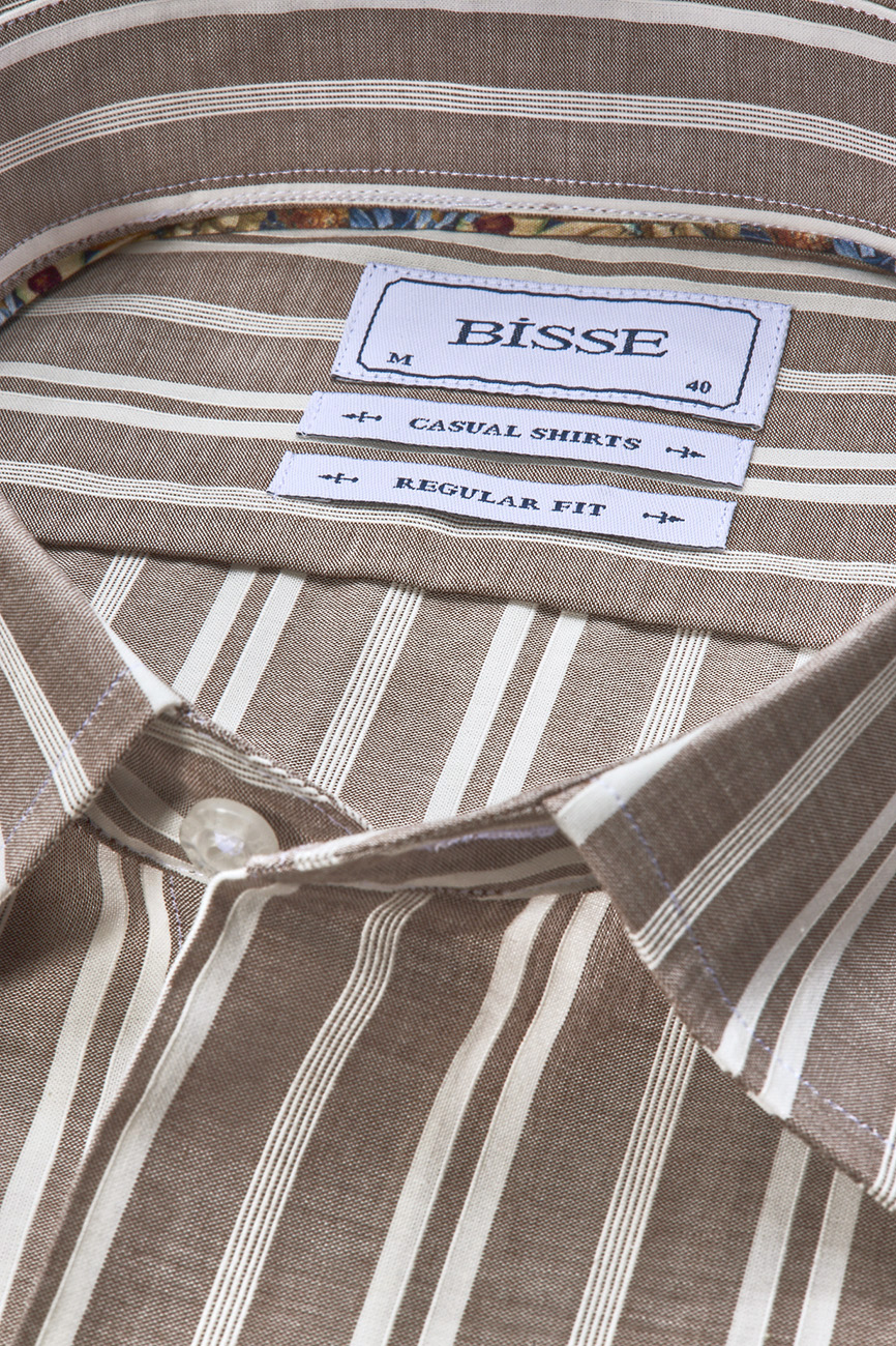 Regular Fit Spor Yaka Çizgili Açık Kahve Pamuk Erkek Gömlek