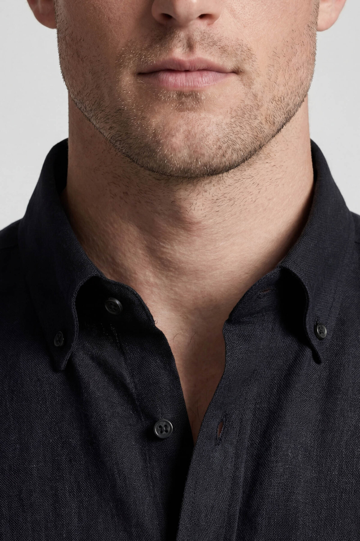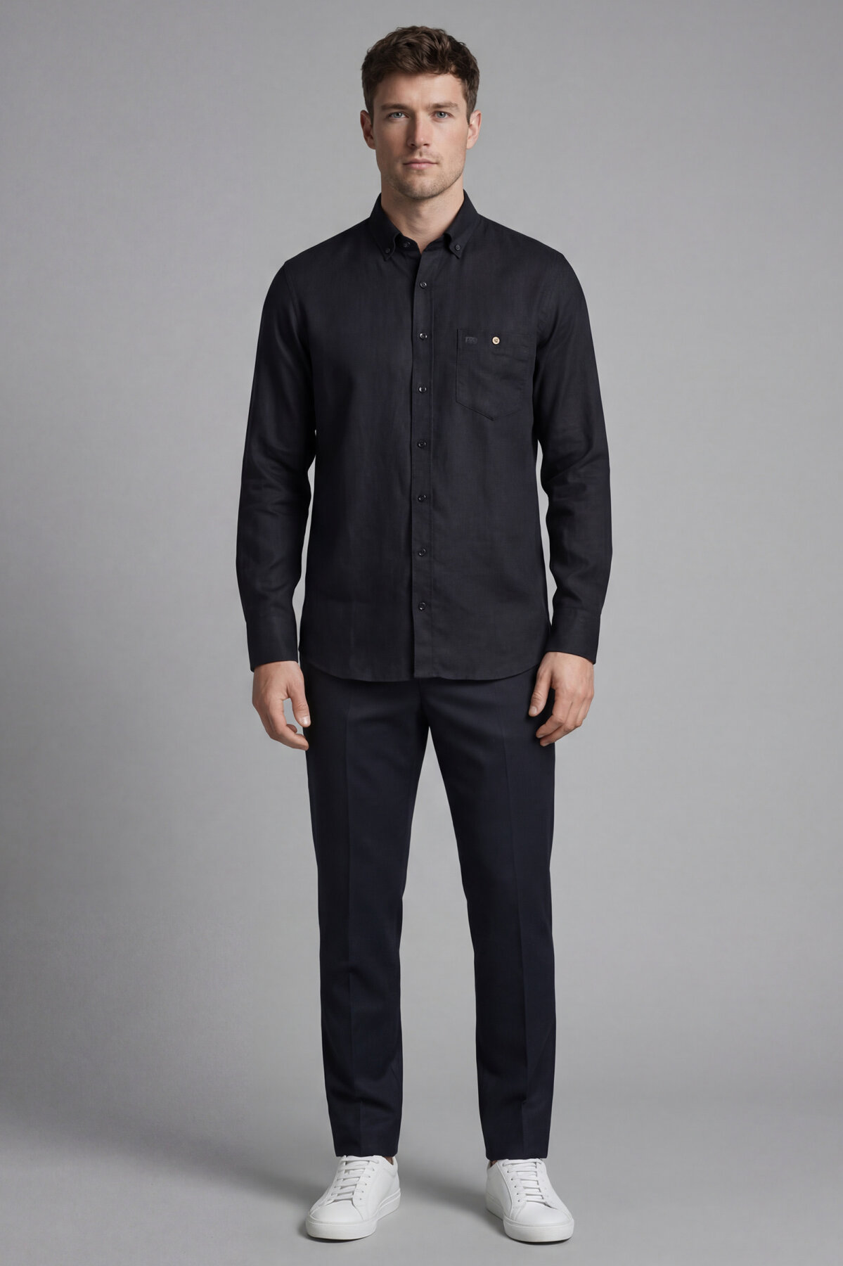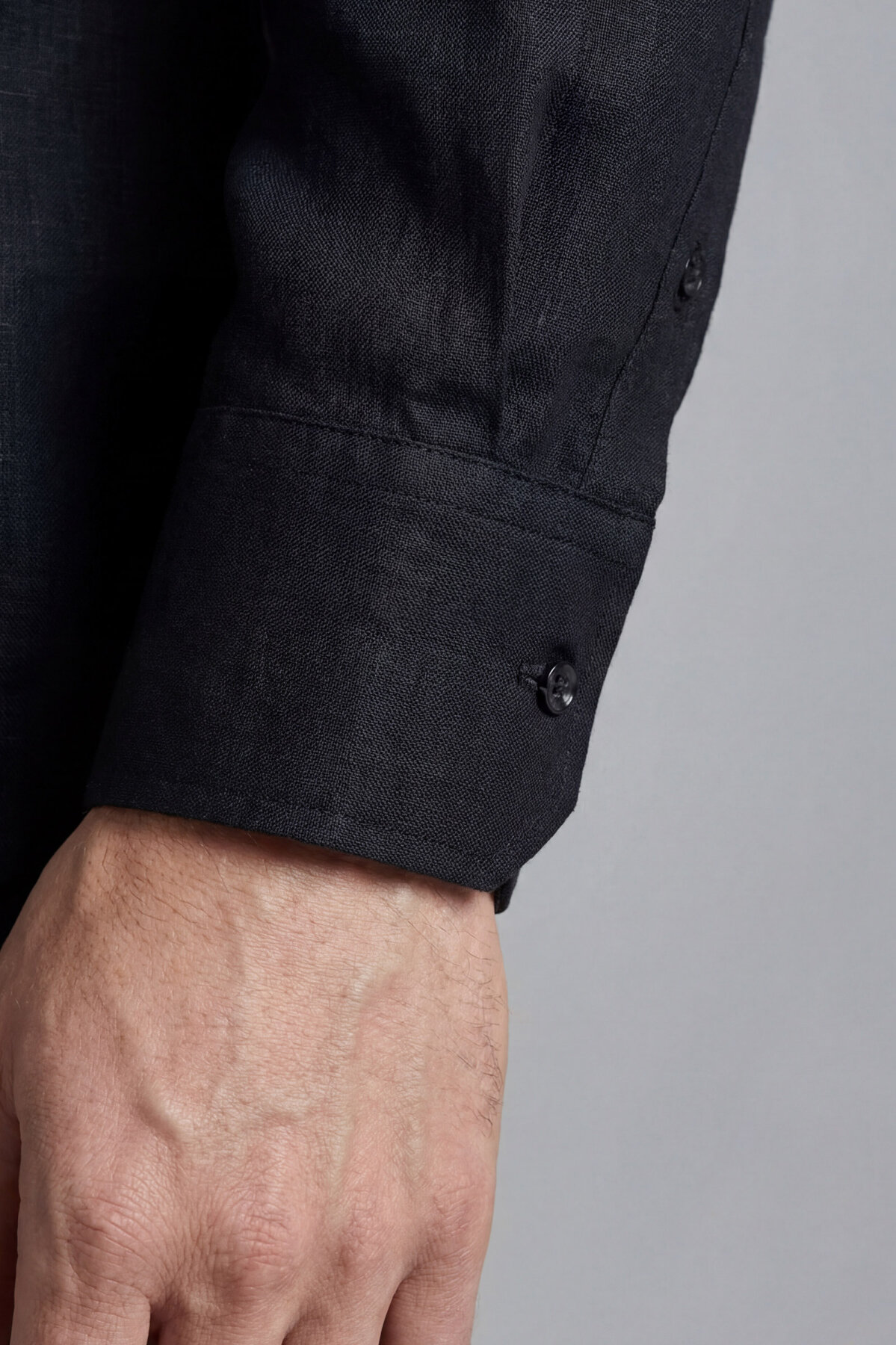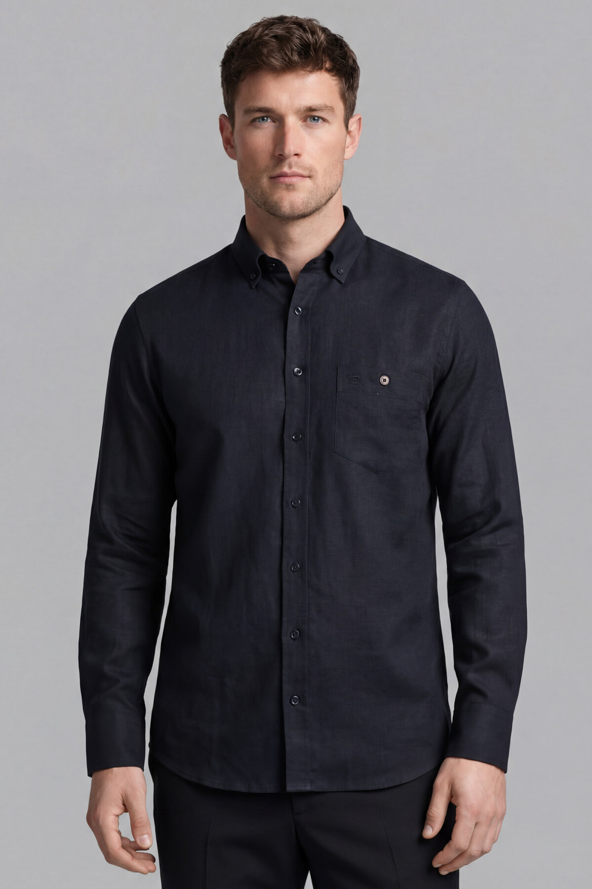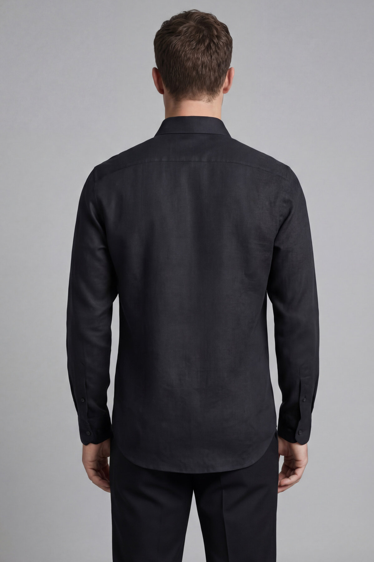Regular Fit Uzun Kol Keten Paşa Yaka Cepli Siyah Erkek Gömlek