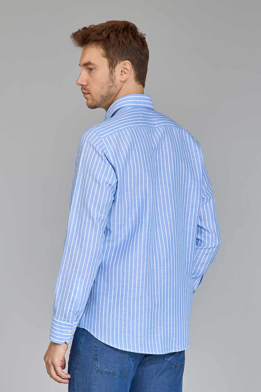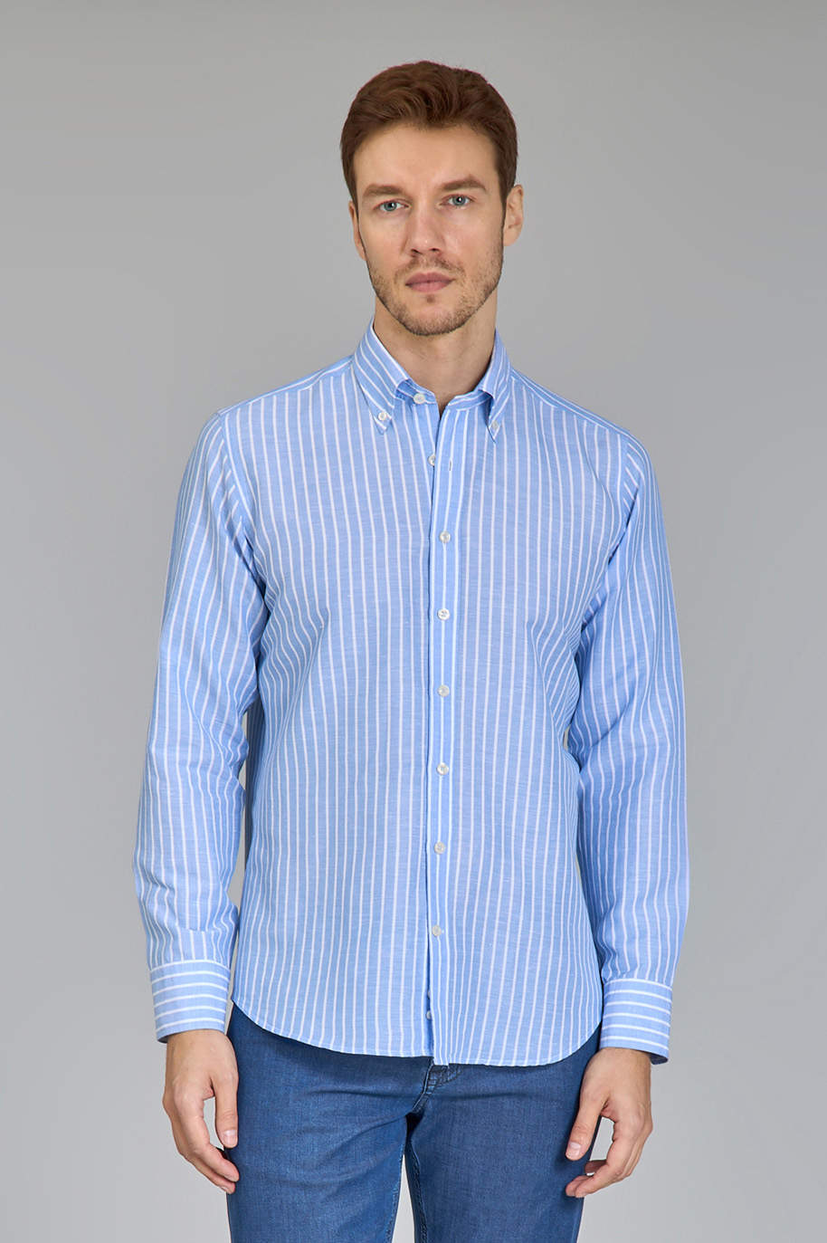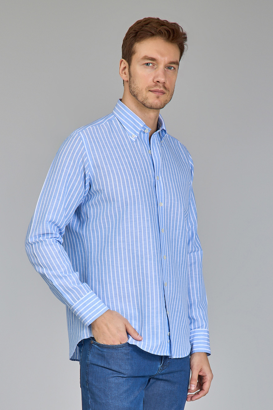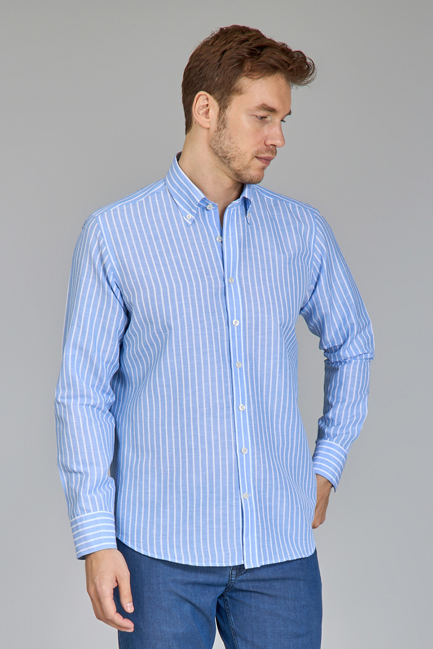 Regular Fit Uzun Kollu Açık Mavi Keten Pamuk Karışımlı Erkek Gömlek
