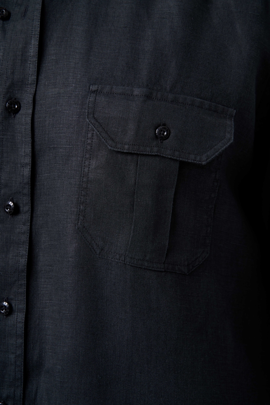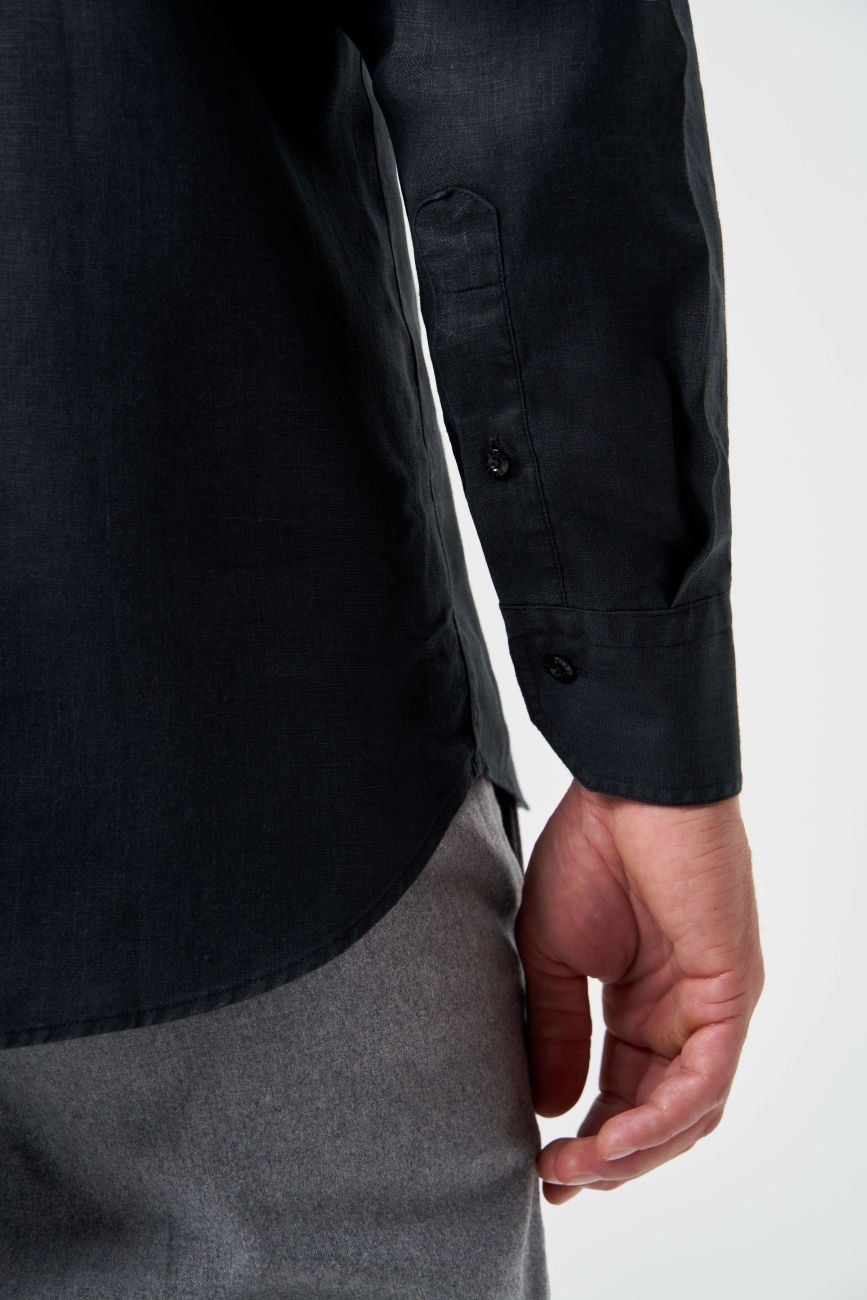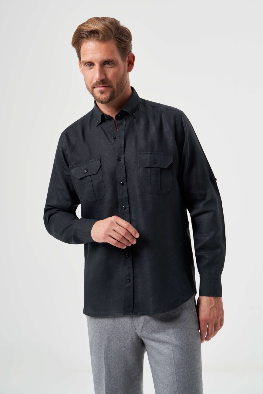 Regular Fit Uzun Kollu Siyah Keten Apoletli Erkek Gömlek