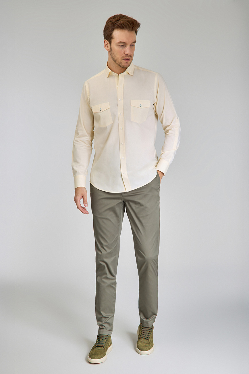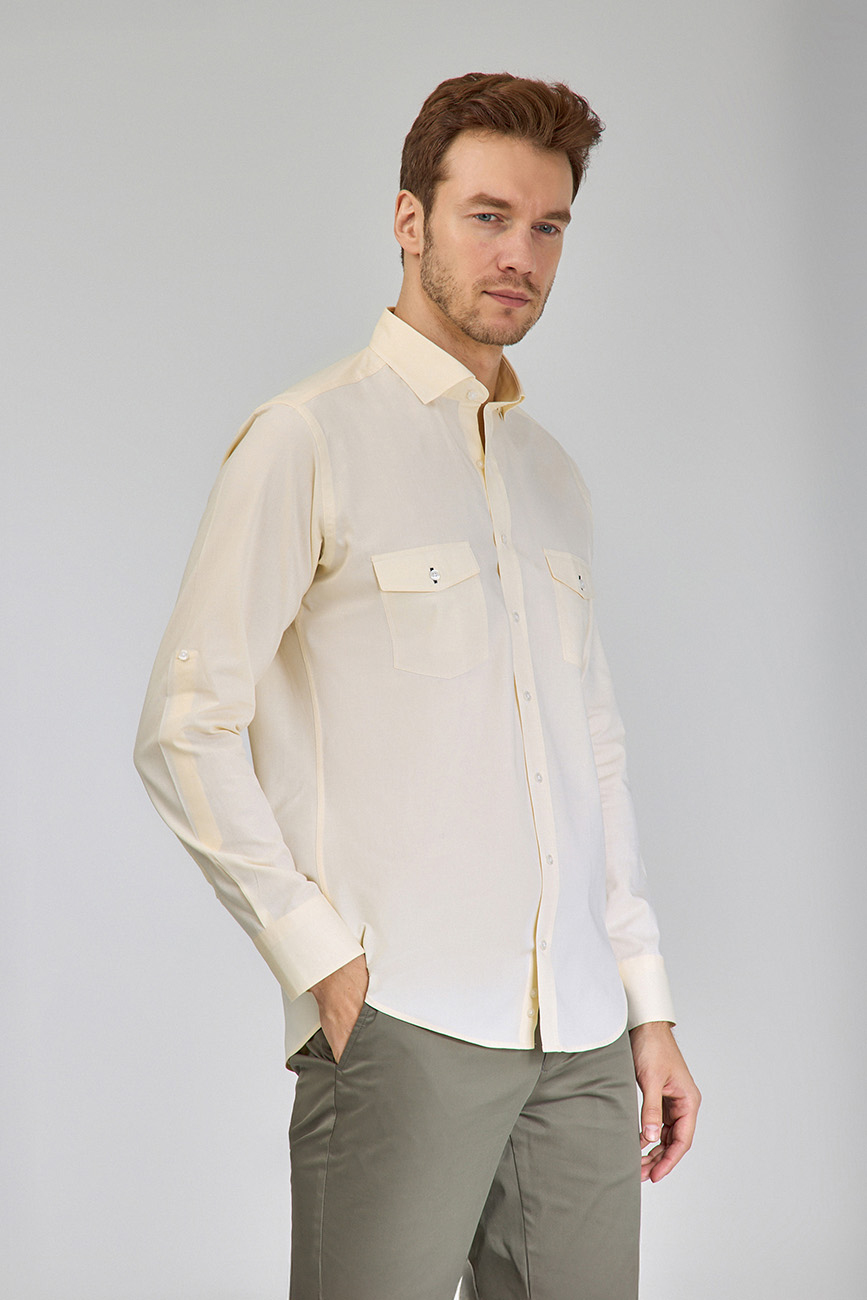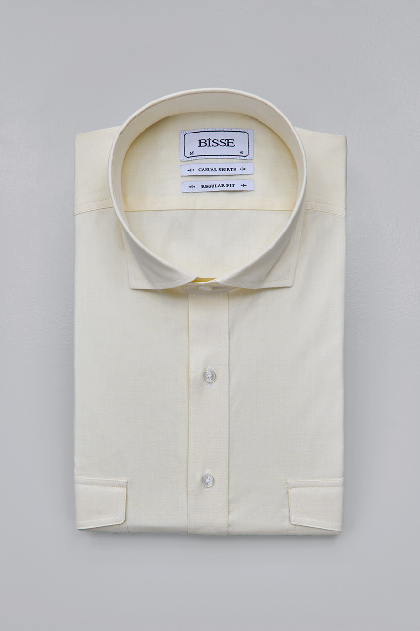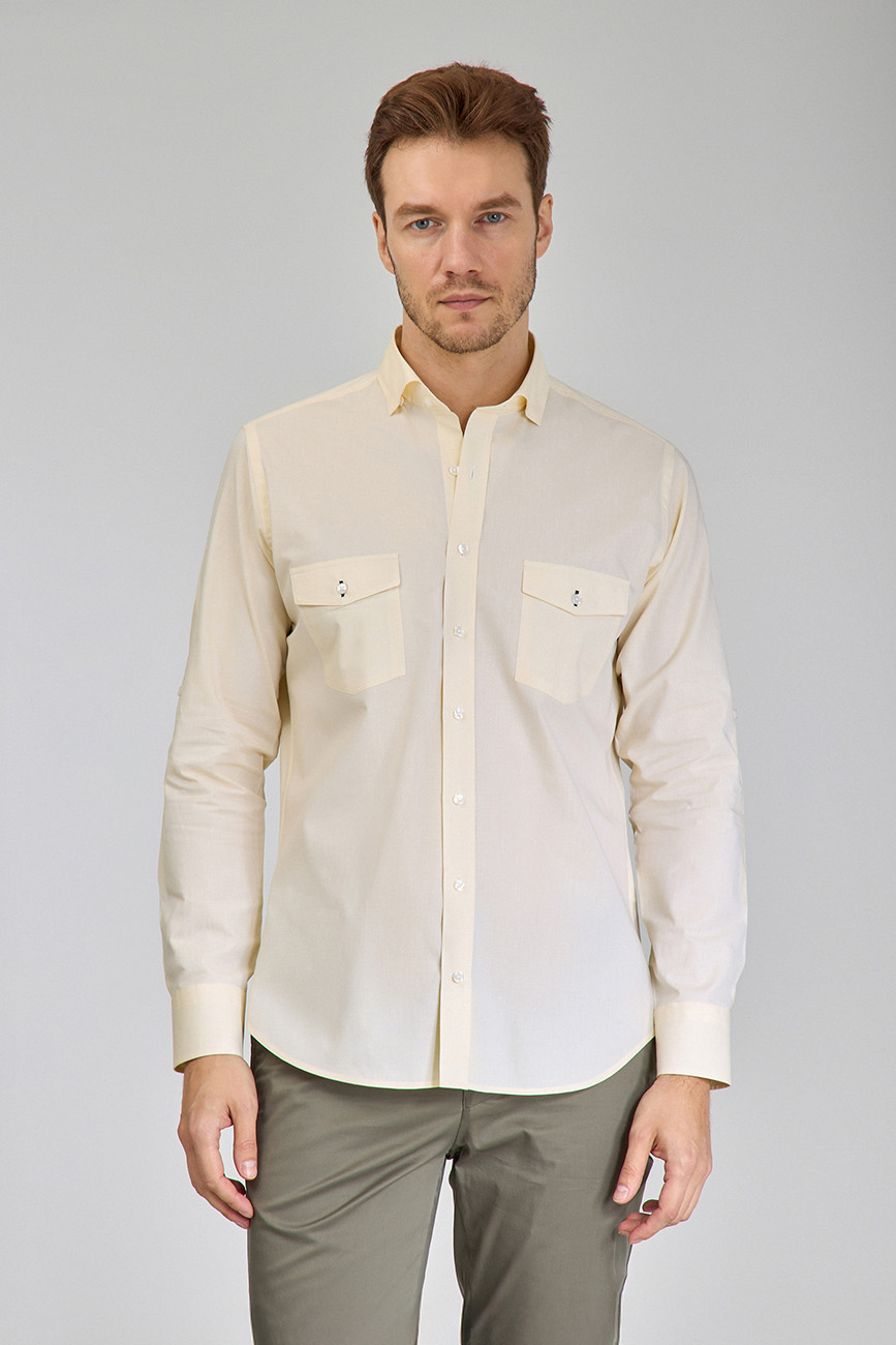 Regular Fit Yaka Düğmeli Sarı Pamuk Erkek Gömlek