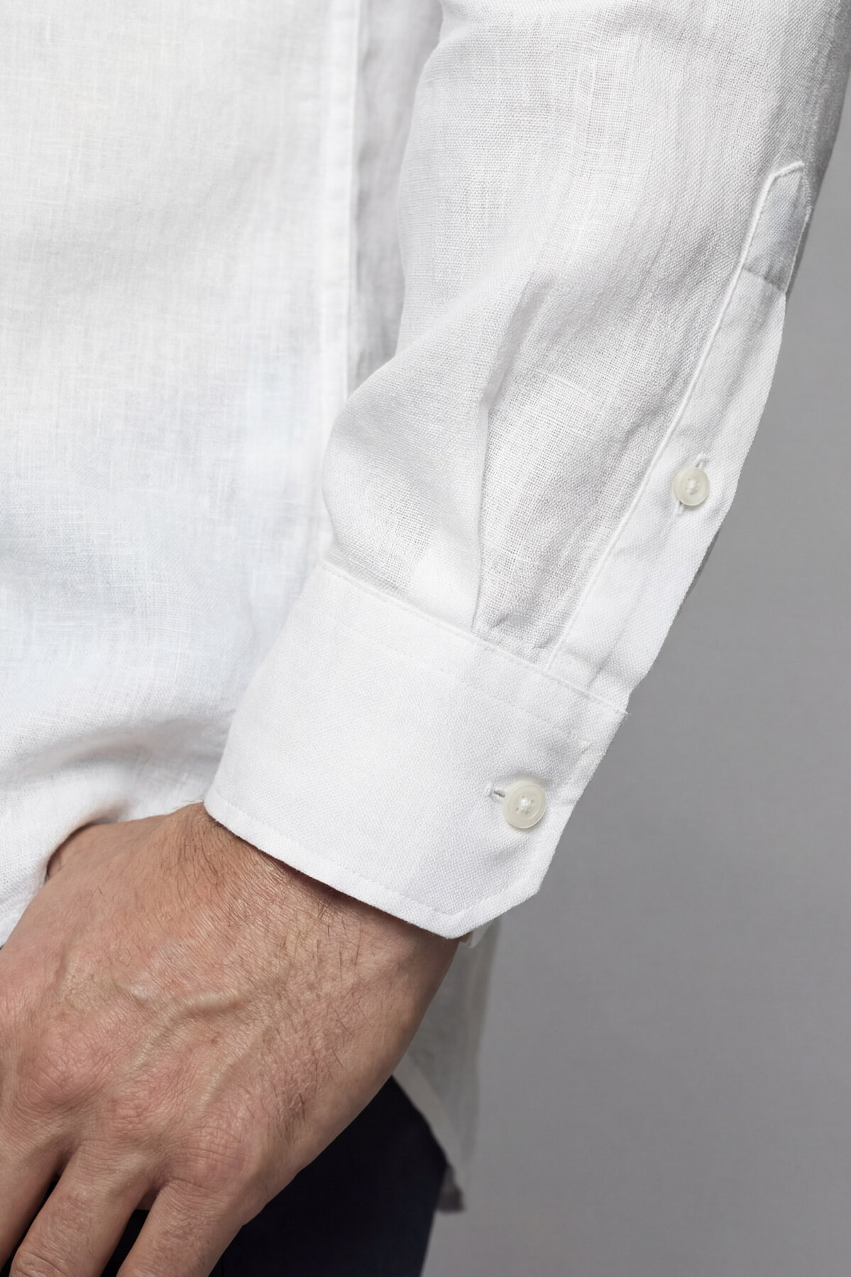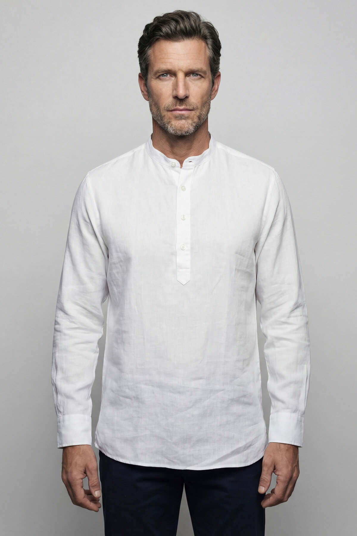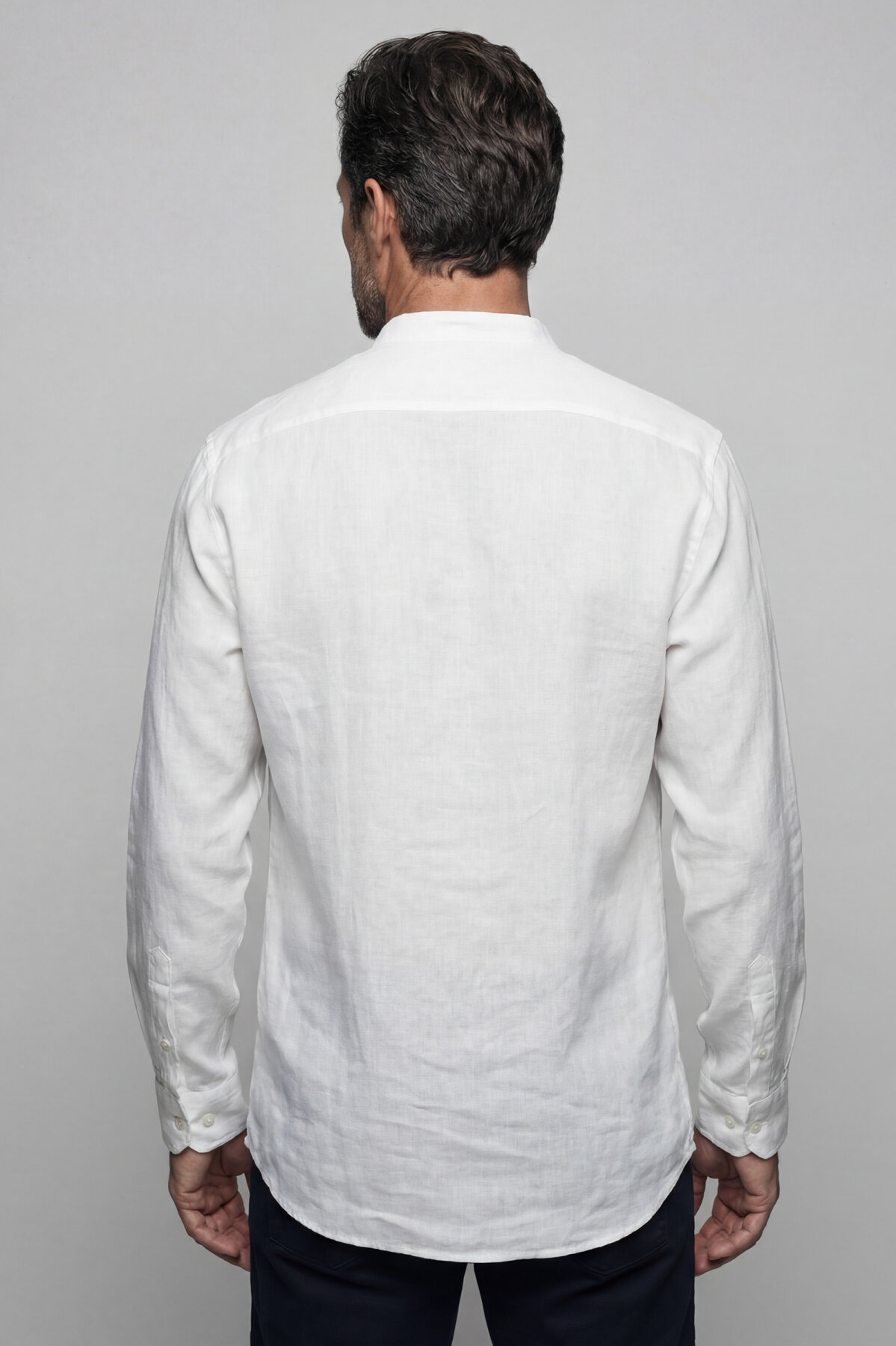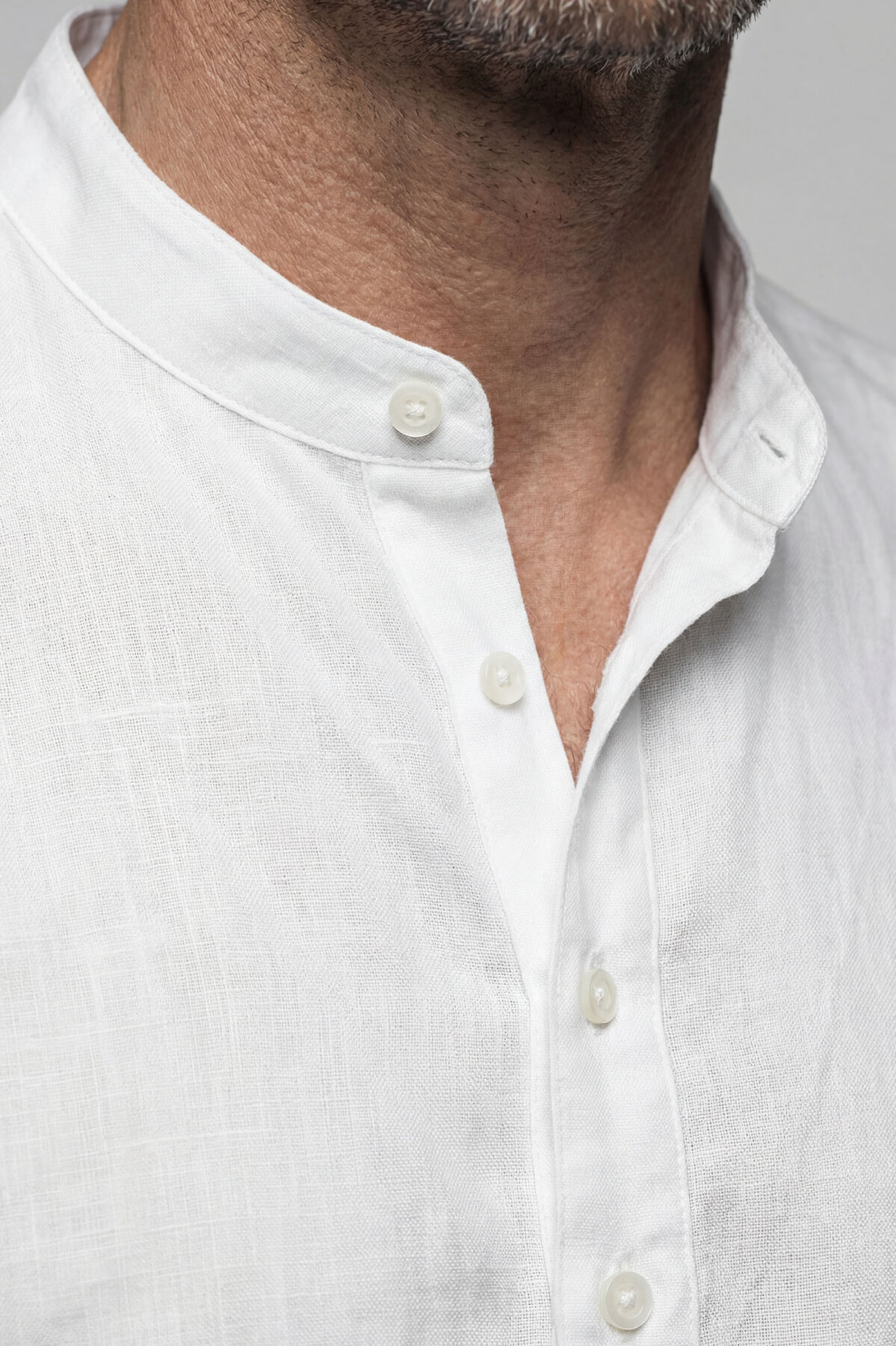 Uzun Kollu Paşa Yaka Cepsiz Sedef Düğmeli Erkek Keten Gömlek Beyaz