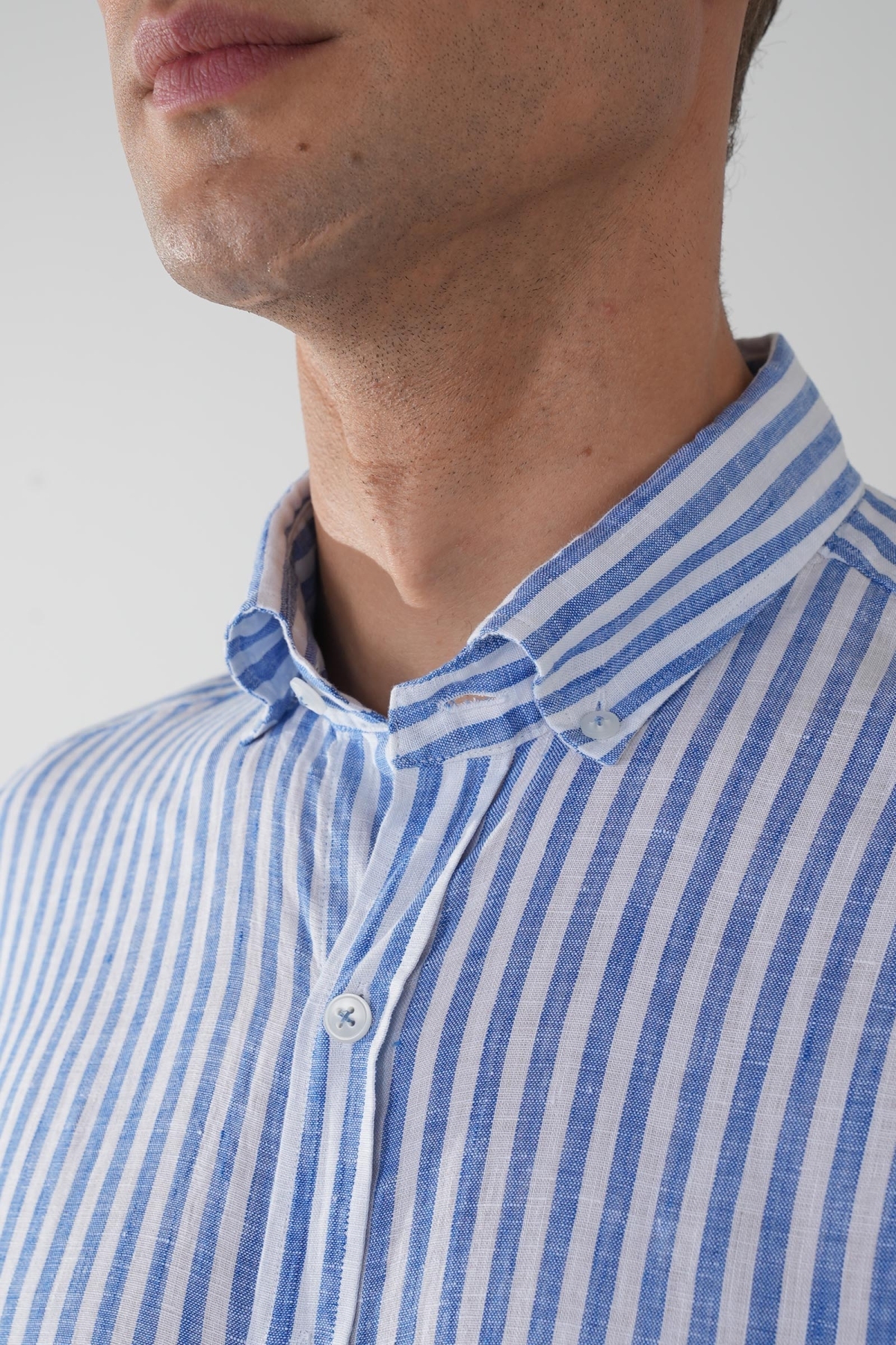 Uzun Kollu Paşa Yaka Cepsiz Sedef Düğmeli Erkek Keten Gömlek Lacivert